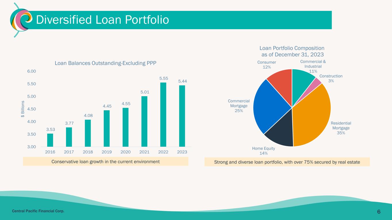 5Central Pacific Financial Corp. Tourism Visitor arrivals compared to pre-pandemic 90% 1 Employment Unemployment Rate December 2023 2.9% 1 FACTORS FOR A FAVORABLE HAWAII OUTLOOK ▪ Maui tourism recovery faster than anticipated ▪ Japanese visitor return increasing, currently at ~49% of pre-pandemic levels ▪ Low unemployment and strong real estate market ▪ Substantial Federal government contracts and military investments ▪ Increase in public and private investments to address housing shortage 1 Source: Hawaii Department of Business, Economic Development & Tourism. Tourism represents total visitor arrivals in December 2023 compared to December 2019. 2 Source: Honolulu Board of Realtors. Resilient Hawaii Economy Housing Oahu Median Single- Family Home Price December 2023 $1.0MM 2 1 Visitors from Japan to Hawaii1