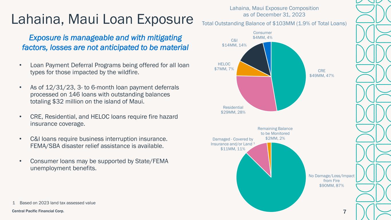 6Central Pacific Financial Corp. Conservative loan growth in the current environment Strong and diverse loan portfolio, with over 75% secured by real estate Diversified Loan Portfolio2 3.53 3.77 4.08 4.45 4.55 5.01 5.55 5.44 3.00 3.50 4.00 4.50 5.00 5.50 6.00 2016 2017 2018 2019 2020 2021 2022 2023 $ B il li o n s Loan Balances Outstanding-Excluding PPP Commercial & Industrial 11% Construction 3% Residential Mortgage 35% Home Equity 14% Commercial Mortgage 25% Consumer 12% Loan Portfolio Composition as of December 31, 2023