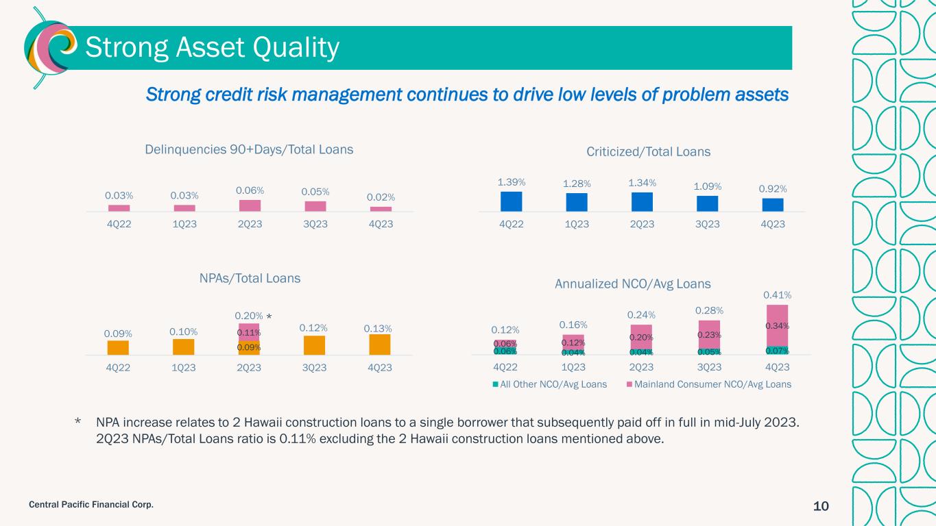 9Central Pacific Financial Corp. 0.00% 1.00% 2.00% 3.00% 4.00% 5.00% 6.00% 2005 2006 2007 2008 2009 2010 2011 2012 2013 2014 2015 2016 2017 2018 2019 2020 2021 2022 1Q23 2Q23 3Q23 4Q23 Total Deposit Cost CPF Peer average* Fed Funds CPF Deposit Cost Advantage * Public banks $3-10 billion in total assets as of 3Q23. Source: S&P Global. Cycle-to-date total deposit beta of 23% as of 4Q23 91 bps funding advantage High valued deposit franchise with proven history of funding cost advantage