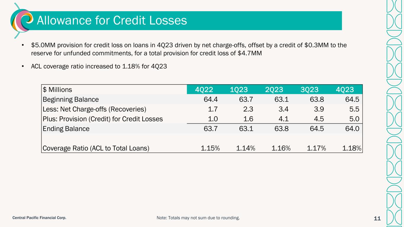 10Central Pacific Financial Corp. 0.09% 0.10% 0.09% 0.12% 0.13% 0.20% 0.11% 4Q22 1Q23 2Q23 3Q23 4Q23 NPAs/Total Loans 0.06% 0.04% 0.04% 0.05% 0.07% 0.06% 0.12% 0.20% 0.23% 0.34%0.12% 0.16% 0.24% 0.28% 0.41% 4Q22 1Q23 2Q23 3Q23 4Q23 Annualized NCO/Avg Loans All Other NCO/Avg Loans Mainland Consumer NCO/Avg Loans Strong Asset Quality5 * NPA increase relates to 2 Hawaii construction loans to a single borrower that subsequently paid off in full in mid-July 2023. 2Q23 NPAs/Total Loans ratio is 0.11% excluding the 2 Hawaii construction loans mentioned above. * Strong credit risk management continues to drive low levels of problem assets 0.03% 0.03% 0.06% 0.05% 0.02% 4Q22 1Q23 2Q23 3Q23 4Q23 Delinquencies 90+Days/Total Loans 1.39% 1.28% 1.34% 1.09% 0.92% 4Q22 1Q23 2Q23 3Q23 4Q23 Criticized/Total Loans