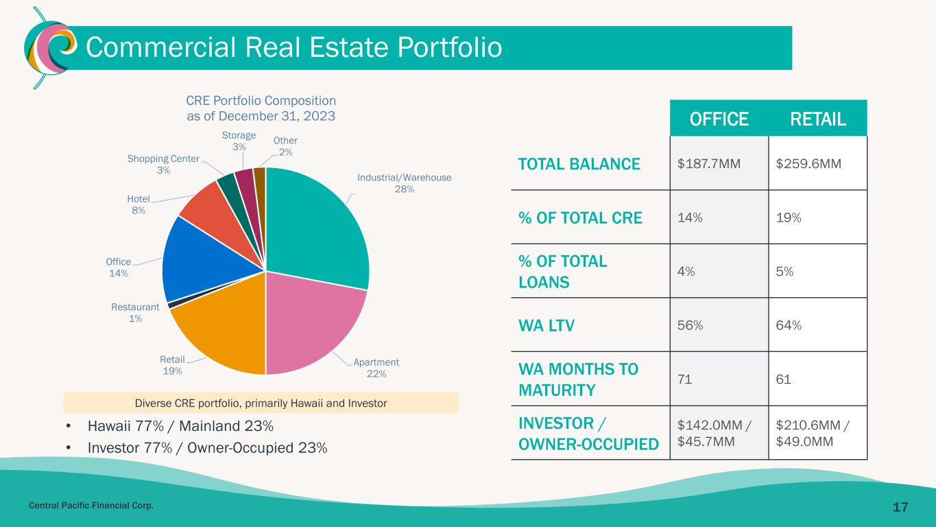 17Central Pacific Financial Corp. Commercial Real Estate Portfolio OFFICE RETAIL TOTAL BALANCE $187.7MM $259.6MM % OF TOTAL CRE 14% 19% % OF TOTAL LOANS 4% 5% WA LTV 56% 64% WA MONTHS TO MATURITY 71 61 INVESTOR / OWNER-OCCUPIED $142.0MM / $45.7MM $210.6MM / $49.0MM Diverse CRE portfolio, primarily Hawaii and Investor • Hawaii 77% / Mainland 23% • Investor 77% / Owner-Occupied 23% Industrial/Warehouse 28% Apartment 22% Retail 19% Restaurant 1% Office 14% Hotel 8% Shopping Center 3% Storage 3% Other 2% CRE Portfolio Composition as of December 31, 2023