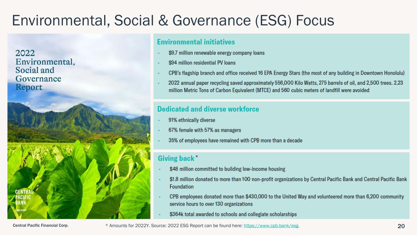 20Central Pacific Financial Corp. Environmental, Social & Governance (ESG) Focus * Amounts for 2022Y. Source: 2022 ESG Report can be found here: https://www.cpb.bank/esg. *