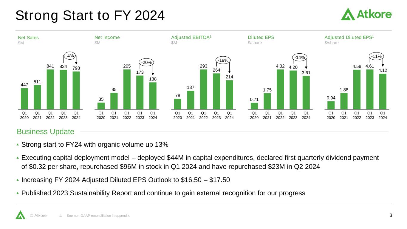 2© Atkore This presentation is provided for general informational purposes only and it does not include every item which may be of interest, nor does it purport to present full and fair disclosure with respect to Atkore Inc. (the “Company” or “Atkore”) or its operational and financial information. Atkore expressly disclaims any current intention to update any forward-looking statements contained in this presentation as a result of new information or future events or developments or otherwise, except as required by federal securities laws. This presentation is not a prospectus and is not an offer to sell securities. This presentation contains forward-looking statements that are subject to known and unknown risks and uncertainties, many of which are beyond our control. All statements other than statements of historical fact included in this presentation are forward-looking statements. Forward-looking statements appearing throughout this presentation include, without limitation, statements regarding our intentions, beliefs, assumptions or current expectations concerning, among other things, financial position; results of operations; cash flows; prospects; growth strategies or expectations; customer retention; the outcome (by judgment or settlement) and costs of legal, administrative or regulatory proceedings, investigations or inspections, including, without limitation, collective, representative or any other litigation; and the impact of prevailing economic conditions. You can identify forward-looking statements by the fact that they do not relate strictly to historical or current facts. These statements may include words such as “believes,” “expects,” “may,” “will,” “shall,” “should,” “would,” “could,” “seeks,” “aims,” “projects,” “is optimistic,” “intends,” “plans,” “estimates,” “anticipates” and other comparable terms. We caution you that forward-looking statements are not guarantees of future performance or outcomes and that actual performance and outcomes, including, without limitation, our actual results of operations, financial condition and liquidity, and the development of the market in which we operate, may differ materially from those made in or suggested by the forward-looking statements contained in this presentation. In addition, even if our results of operations, financial condition and cash flows, and the development of the market in which we operate, are consistent with the forward-looking statements contained in this presentation, those results or developments may not be indicative of results or developments in subsequent periods. A number of important factors, including, without limitation, the risks and uncertainties disclosed in the Company’s filings with the U.S. Securities and Exchange Commission, including but not limited to the Company’s most recent Annual Report on Form 10-K and reports on Form 10-Q and Form 8-K could cause actual results and outcomes to differ materially from those reflected in the forward-looking statements. Because of these risks, we caution that you should not place undue reliance on any of our forward-looking statements. New risks and uncertainties arise from time to time, and it is impossible for us to predict those events or how they may affect us. Further, any forward-looking statement speaks only as of the date on which it is made. We undertake no obligation to revise the forward-looking statements in this presentation after the date of this presentation. Market data and industry information used throughout this presentation are based on management’s knowledge of the industry and the good faith estimates of management. We also relied, to the extent available, upon management’s review of independent industry surveys, forecasts and publications and other publicly available information prepared by a number of third-party sources. All of the market data and industry information used in this presentation involves a number of assumptions and limitations which we believe to be reasonable, but you are cautioned not to give undue weight to such estimates. Although we believe that these sources are reliable, we cannot guarantee the accuracy or completeness of this information, and we have not independently verified this information. While we believe the estimated market position, market opportunity and market size information included in this presentation are generally reliable, such information, which is derived in part from management’s estimates and beliefs, is inherently uncertain and imprecise. Projections, assumptions and estimates of our future performance and the future performance of the industry in which we operate are subject to a high degree of uncertainty and risk due to a variety of factors, including those described above. These and other factors could cause results to differ materially from those expressed in our estimates and beliefs and in the estimates prepared by independent parties. This presentation should be read along with the historical financial statements of Atkore, including the most recent audited financial statements. Historical results may not be indicative of future results. We use non-GAAP financial measures to help us describe our operating and financial performance. These measures may include Adjusted EBITDA, Adjusted EBITDA margin (Adjusted EBITDA over Net sales), Net debt (total debt less cash and cash equivalents), Adjusted Net Income Per Diluted Share (also referred to as “Adjusted Diluted EPS”), Leverage ratio (net debt or total debt less cash and cash equivalents, over Adjusted EBITDA on trailing twelve month (“TTM”) basis), Free Cash Flow (net cash provided by operating activities less capital expenditures) and Return on Capital to help us describe our operating and financial performance. These non-GAAP financial measures are commonly used in our industry and have certain limitations and should not be construed as alt