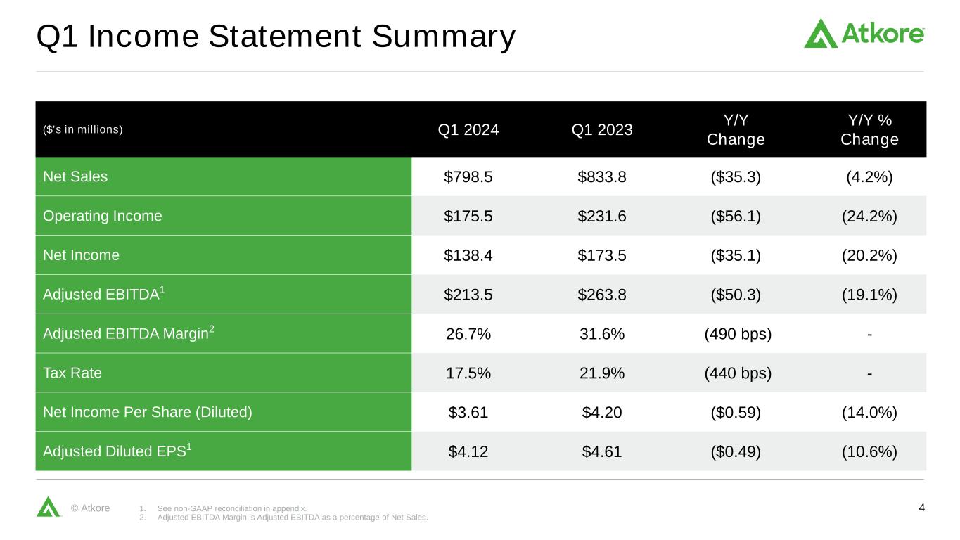 3© Atkore Strong Start to FY 2024 1. See non-GAAP reconciliation in appendix. 447 511 841 834 798 Q1 2020 Q1 2021 Q1 2022 Q1 2023 Q1 2024 -4% 35 85 205 173 138 Q1 2020 Q1 2021 Q1 2022 Q1 2023 Q1 2024 -20% 78 137 293 264 214 Q1 2020 Q1 2021 Q1 2022 Q1 2023 Q1 2024 -19% 0.94 1.88 4.58 4.61 4.12 Q1 2020 Q1 2021 Q1 2022 Q1 2023 Q1 2024 -11% Net Sales $M Net Income $M Adjusted EBITDA1 $M Adjusted Diluted EPS1 $/share 0.71 1.75 4.32 4.20 3.61 Q1 2020 Q1 2021 Q1 2022 Q1 2023 Q1 2024 -14% Diluted EPS $/share Strong start to FY24 with organic volume up 13% Executing capital deployment model – deployed $44M in capital expenditures, declared first quarterly dividend payment of $0.32 per share, repurchased $96M in stock in Q1 2024 and have repurchased $23M in Q2 2024 Increasing FY 2024 Adjusted Diluted EPS Outlook to $16.50 – $17.50 Published 2023 Sustainability Report and continue to gain external recognition for our progress Business Update