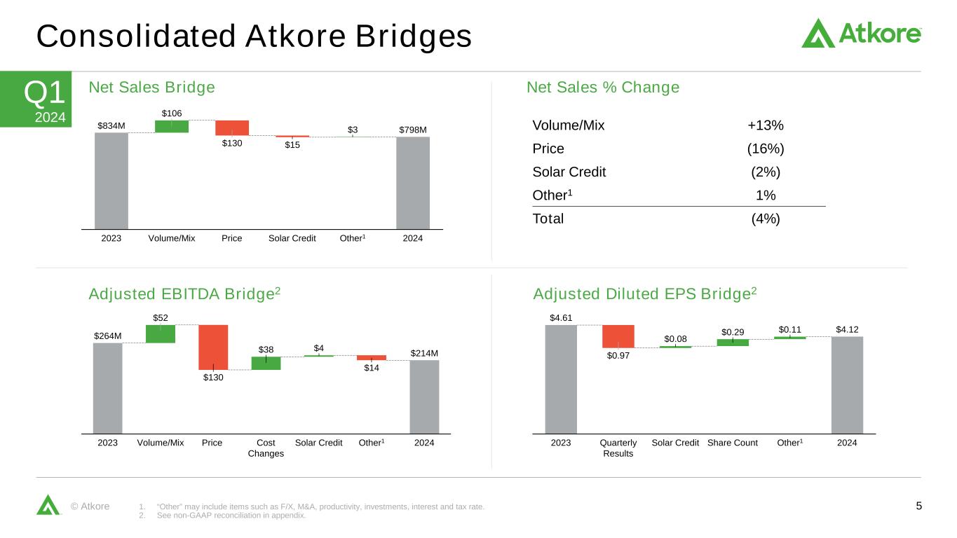 4© Atkore Q1 Income Statement Summary 1. See non-GAAP reconciliation in appendix. 2. Adjusted EBITDA Margin is Adjusted EBITDA as a percentage of Net Sales. ($’s in millions) Q1 2024 Q1 2023 Y/Y Change Y/Y % Change Net Sales $798.5 $833.8 ($35.3) (4.2%) Operating Income $175.5 $231.6 ($56.1) (24.2%) Net Income $138.4 $173.5 ($35.1) (20.2%) Adjusted EBITDA1 $213.5 $263.8 ($50.3) (19.1%) Adjusted EBITDA Margin2 26.7% 31.6% (490 bps) - Tax Rate 17.5% 21.9% (440 bps) - Net Income Per Share (Diluted) $3.61 $4.20 ($0.59) (14.0%) Adjusted Diluted EPS1 $4.12 $4.61 ($0.49) (10.6%)