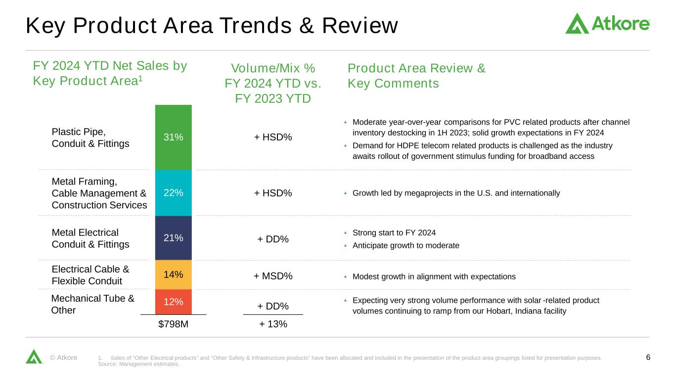 5© Atkore Consolidated Atkore Bridges 1. “Other” may include items such as F/X, M&A, productivity, investments, interest and tax rate. 2. See non-GAAP reconciliation in appendix. Adjusted EBITDA Bridge2 Net Sales BridgeQ1 2024 $106 $130 $15 $3 2023 Volume/Mix Price Solar Credit Other1 2024 $834M $798M $52 $130 $38 $4 $14 2023 Volume/Mix Price Cost Changes Solar Credit Other1 2024 $264M $214M Net Sales % Change $4.61 $4.12 $0.97 $0.08 $0.29 $0.11 2023 Quarterly Results Solar Credit Share Count Other1 2024 Adjusted Diluted EPS Bridge2 Volume/Mix +13% Price (16%) Solar Credit (2%) Other1 1% Total (4%)