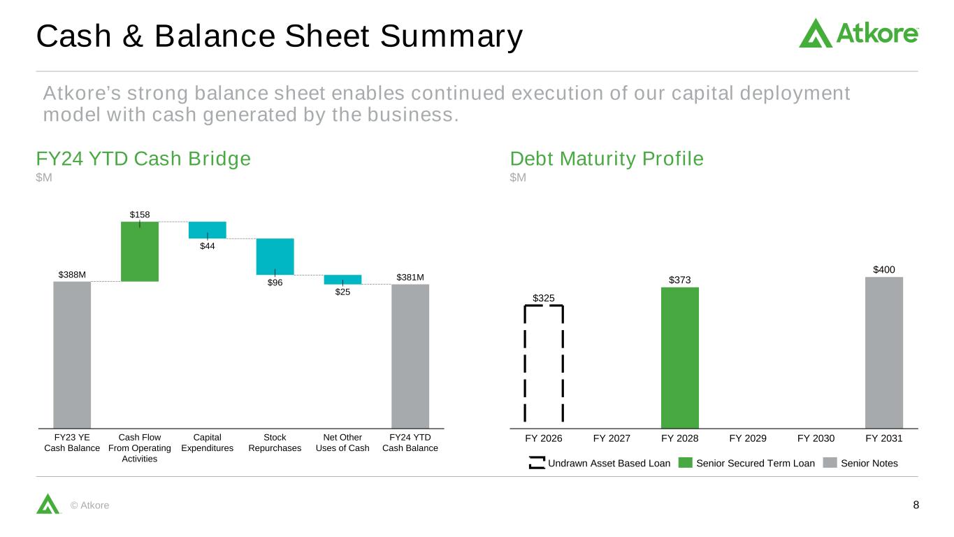 7© Atkore Segment Results $66 $114 $3 2023 Volume/Mix Price Other1 2024 $639M $594M Q1 Net Sales Bridge $41 $16 $15 2023 Volume/Mix Price Solar Credit $0 Other1 2024 $195M $205M Q1 Net Sales Bridge Electrical Safety & Infrastructure ($’s in millions) Q1 2024 Q1 2023 Y/Y Change Net Sales $593.7 $638.7 (7.1%) Adjusted EBITDA $204.4 $243.8 (16.2%) Adjusted EBITDA Margin 34.4% 38.2% (380 bps) ($’s in millions) Q1 2024 Q1 2023 Y/Y Change Net Sales $205.1 $195.3 5.1% Adjusted EBITDA $19.5 $33.4 (41.6%) Adjusted EBITDA Margin 9.5% 17.1% (760 bps) 1. “Other” may include items such as F/X, M&A, productivity, investments, interest and tax rate. Includes ~$7M related to start-up costs at our new Indiana facility