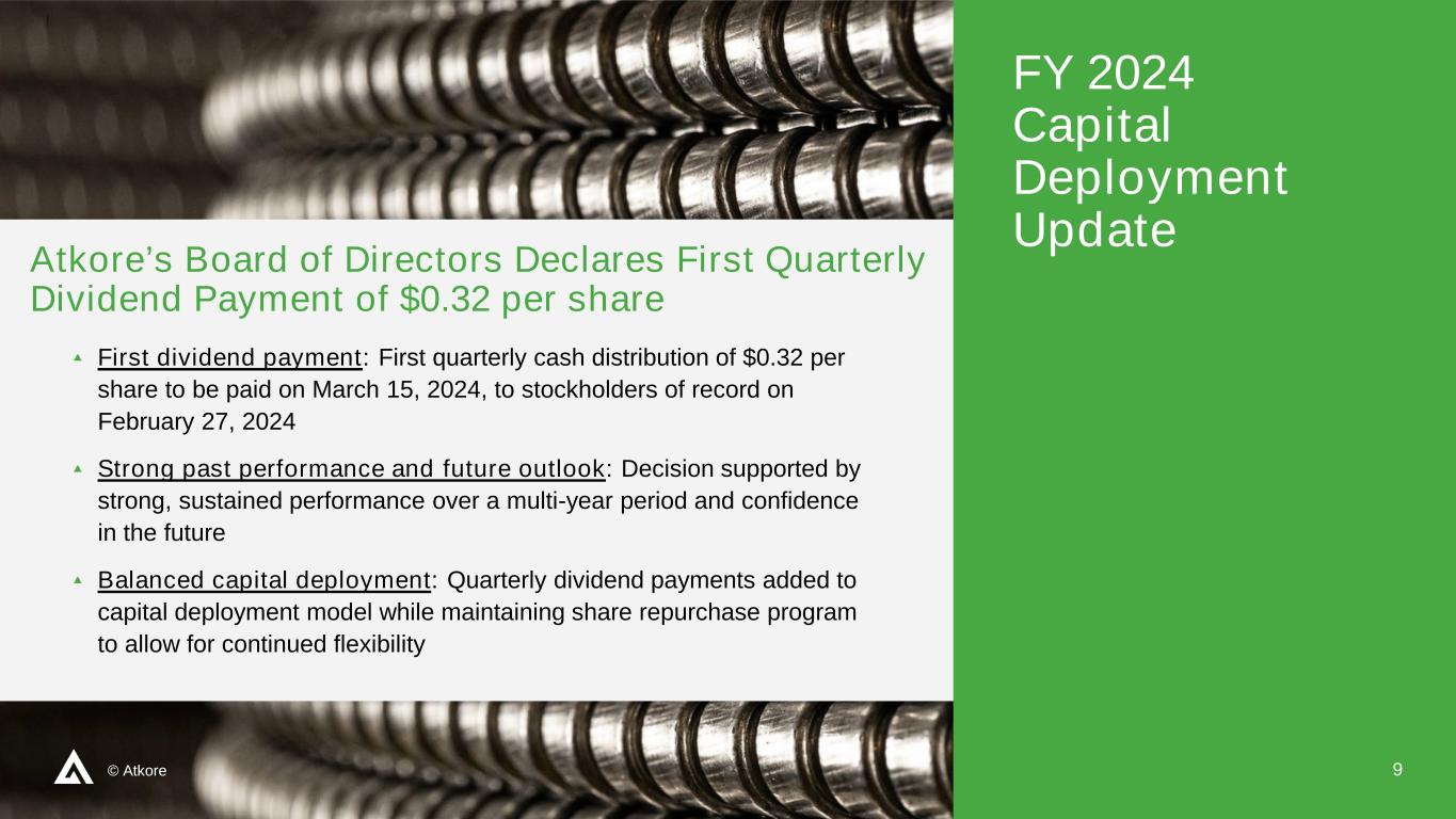 8© Atkore FY24 YTD Cash Bridge $M Cash & Balance Sheet Summary $158 $44 $96 $25 FY23 YE Cash Balance Cash Flow From Operating Activities Capital Expenditures Stock Repurchases Net Other Uses of Cash FY24 YTD Cash Balance $388M $381M Debt Maturity Profile $M $325 $373 $400 FY 2026 FY 2027 FY 2028 FY 2029 FY 2030 FY 2031 Undrawn Asset Based Loan Senior Secured Term Loan Senior Notes Atkore’s strong balance sheet enables continued execution of our capital deployment model with cash generated by the business.
