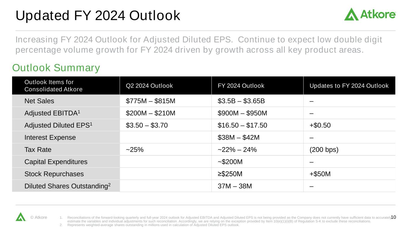 9© Atkore 9 Atkore’s Board of Directors Declares First Quarterly Dividend Payment of $0.32 per share First dividend payment: First quarterly cash distribution of $0.32 per share to be paid on March 15, 2024, to stockholders of record on February 27, 2024 Strong past performance and future outlook: Decision supported by strong, sustained performance over a multi-year period and confidence in the future Balanced capital deployment: Quarterly dividend payments added to capital deployment model while maintaining share repurchase program to allow for continued flexibility FY 2024 Capital Deployment Update