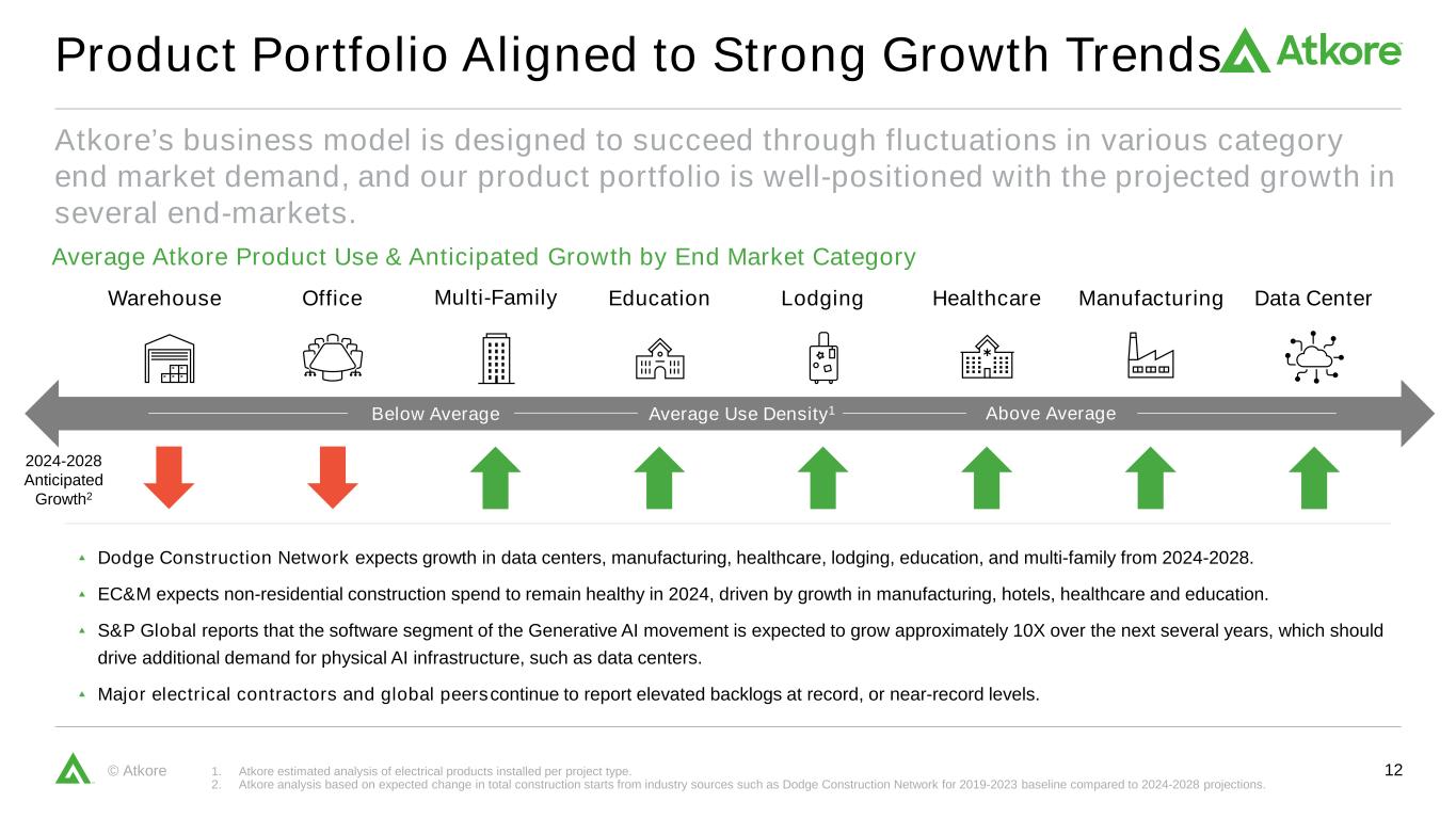 11© Atkore Portfolio of Electrical Infrastructure products support a broad range of construction projects and are installed at various stages throughout a project’s lifecycle. Buildings Need Electricity, Our Portfolio Delivers Over 90% of Atkore is “Electrical Infrastructure” CommercialIndustrial Institutional TransportationUtility ResidentialMeeting the growing electrical needs for: 16% 76% FY 2023 Net Sales $3.5B Example Electrical Conduit & Cable Products Include: PVC Conduit & Fittings Steel Conduit & Fittings Armored Cable Flexible & Liquidtight Conduit Fiberglass Conduit & Fittings HDPE Conduit Safety & Infrastructure -- "All Other" Safety & Infrastructure – “Electrical Support” Electrical Safety & Infrastructure – “ l t r” Example Electrical Support System Products Include: Metal Framing Solar Support Construction Services Wire Basket & Cable Tray Prefabricated Devices Sub-Station Protection & Security