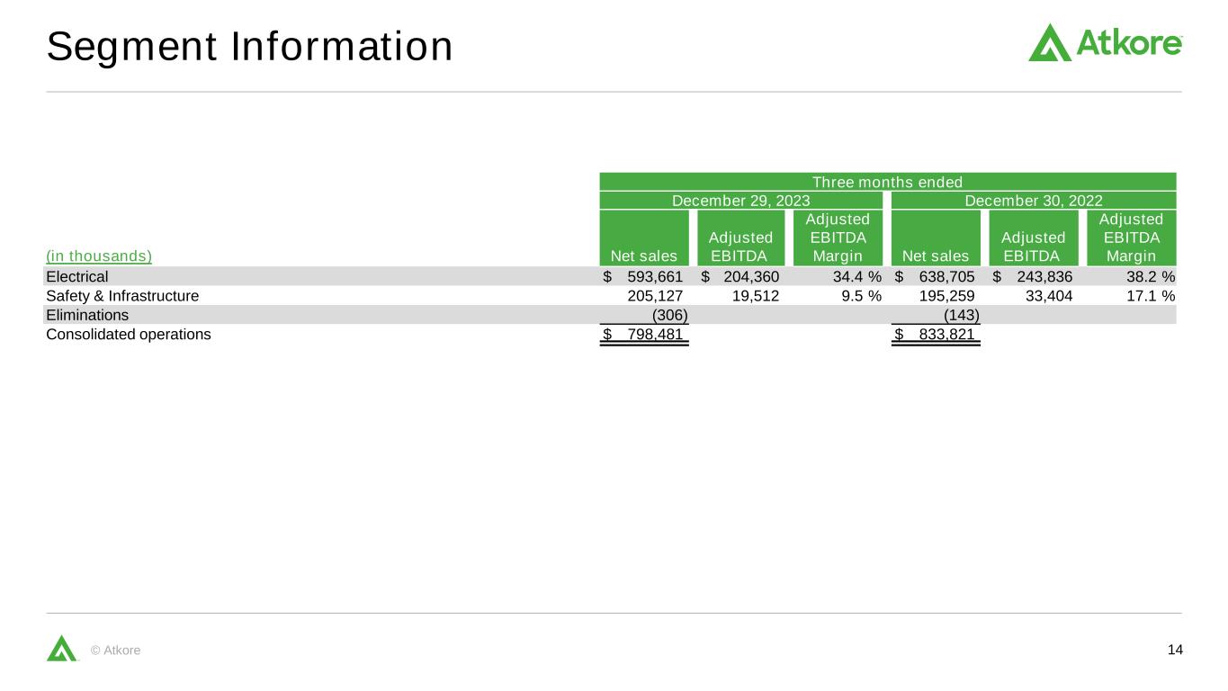 14© Atkore Segment Information Three months ended December 29, 2023 December 30, 2022 (in thousands) Net sales Adjusted EBITDA Adjusted EBITDA Margin Net sales Adjusted EBITDA Adjusted EBITDA Margin Electrical $ 593,661 $ 204,360 34.4 % $ 638,705 $ 243,836 38.2 % Safety & Infrastructure 205,127 19,512 9.5 % 195,259 33,404 17.1 % Eliminations (306) (143) Consolidated operations $ 798,481 $ 833,821