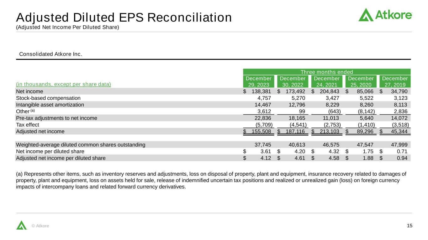 15© Atkore Consolidated Atkore Inc. Adjusted Diluted EPS Reconciliation (Adjusted Net Income Per Diluted Share) Three months ended (in thousands, except per share data) December 29, 2023 December 30, 2022 December 24, 2021 December 25, 2020 December 27, 2019 Net income $ 138,381 $ 173,492 $ 204,843 $ 85,066 $ 34,790 Stock-based compensation 4,757 5,270 3,427 5,522 3,123 Intangible asset amortization 14,467 12,796 8,229 8,260 8,113 Other (a) 3,612 99 (643) (8,142) 2,836 Pre-tax adjustments to net income 22,836 18,165 11,013 5,640 14,072 Tax effect (5,709) (4,541) (2,753) (1,410) (3,518) Adjusted net income $ 155,508 $ 187,116 $ 213,103 $ 89,296 $ 45,344 Weighted-average diluted common shares outstanding 37,745 40,613 46,575 47,547 47,999 Net income per diluted share $ 3.61 $ 4.20 $ 4.32 $ 1.75 $ 0.71 Adjusted net income per diluted share $ 4.12 $ 4.61 $ 4.58 $ 1.88 $ 0.94 (a) Represents other items, such as inventory reserves and adjustments, loss on disposal of property, plant and equipment, insurance recovery related to damages of property, plant and equipment, loss on assets held for sale, release of indemnified uncertain tax positions and realized or unrealized gain (loss) on foreign currency impacts of intercompany loans and related forward currency derivatives.