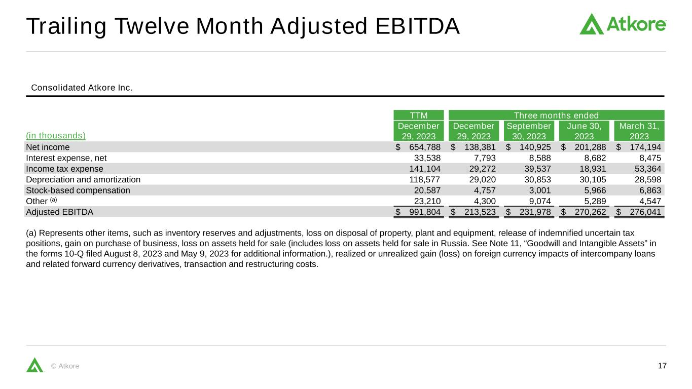 16© Atkore Net Income to Adjusted EBITDA Reconciliation Consolidated Atkore Inc. Three months ended (in thousands) December 29, 2023 December 30, 2022 December 24, 2021 December 25, 2020 December 27, 2019 Net income $ 138,381 $ 173,492 $ 204,843 $ 85,066 $ 34,790 Interest expense, net 7,793 9,488 6,918 8,254 10,620 Income tax expense 29,272 48,559 56,975 26,964 7,340 Depreciation and amortization 29,020 25,967 20,046 19,044 18,730 Stock-based compensation 4,757 5,270 3,427 5,522 3,123 Other (a) 4,300 1,069 801 (7,860) 3,107 Adjusted EBITDA $ 213,523 $ 263,845 $ 293,010 $ 136,990 $ 77,710 (a) Represents other items, such as inventory reserves and adjustments, loss on disposal of property, plant and equipment, release of indemnified uncertain tax positions, gain on purchase of business, loss on assets held for sale, realized or unrealized gain (loss) on foreign currency impacts of intercompany loans and related forward currency derivatives, transaction and restructuring costs.