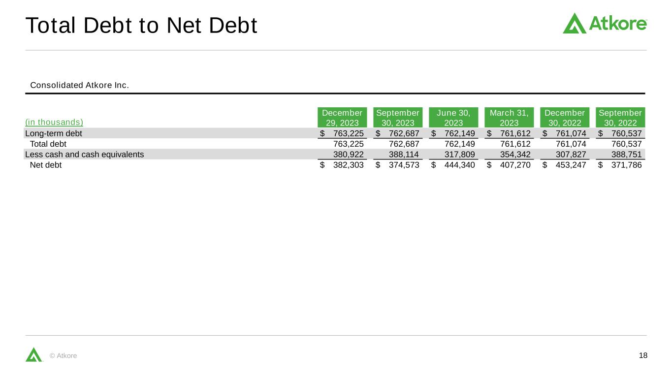 17© Atkore Trailing Twelve Month Adjusted EBITDA Consolidated Atkore Inc. TTM Three months ended (in thousands) December 29, 2023 December 29, 2023 September 30, 2023 June 30, 2023 March 31, 2023 Net income $ 654,788 $ 138,381 $ 140,925 $ 201,288 $ 174,194 Interest expense, net 33,538 7,793 8,588 8,682 8,475 Income tax expense 141,104 29,272 39,537 18,931 53,364 Depreciation and amortization 118,577 29,020 30,853 30,105 28,598 Stock-based compensation 20,587 4,757 3,001 5,966 6,863 Other (a) 23,210 4,300 9,074 5,289 4,547 Adjusted EBITDA $ 991,804 $ 213,523 $ 231,978 $ 270,262 $ 276,041 (a) Represents other items, such as inventory reserves and adjustments, loss on disposal of property, plant and equipment, release of indemnified uncertain tax positions, gain on purchase of business, loss on assets held for sale (includes loss on assets held for sale in Russia. See Note 11, “Goodwill and Intangible Assets” in the forms 10-Q filed August 8, 2023 and May 9, 2023 for additional information.), realized or unrealized gain (loss) on foreign currency impacts of intercompany loans and related forward currency derivatives, transaction and restructuring costs.