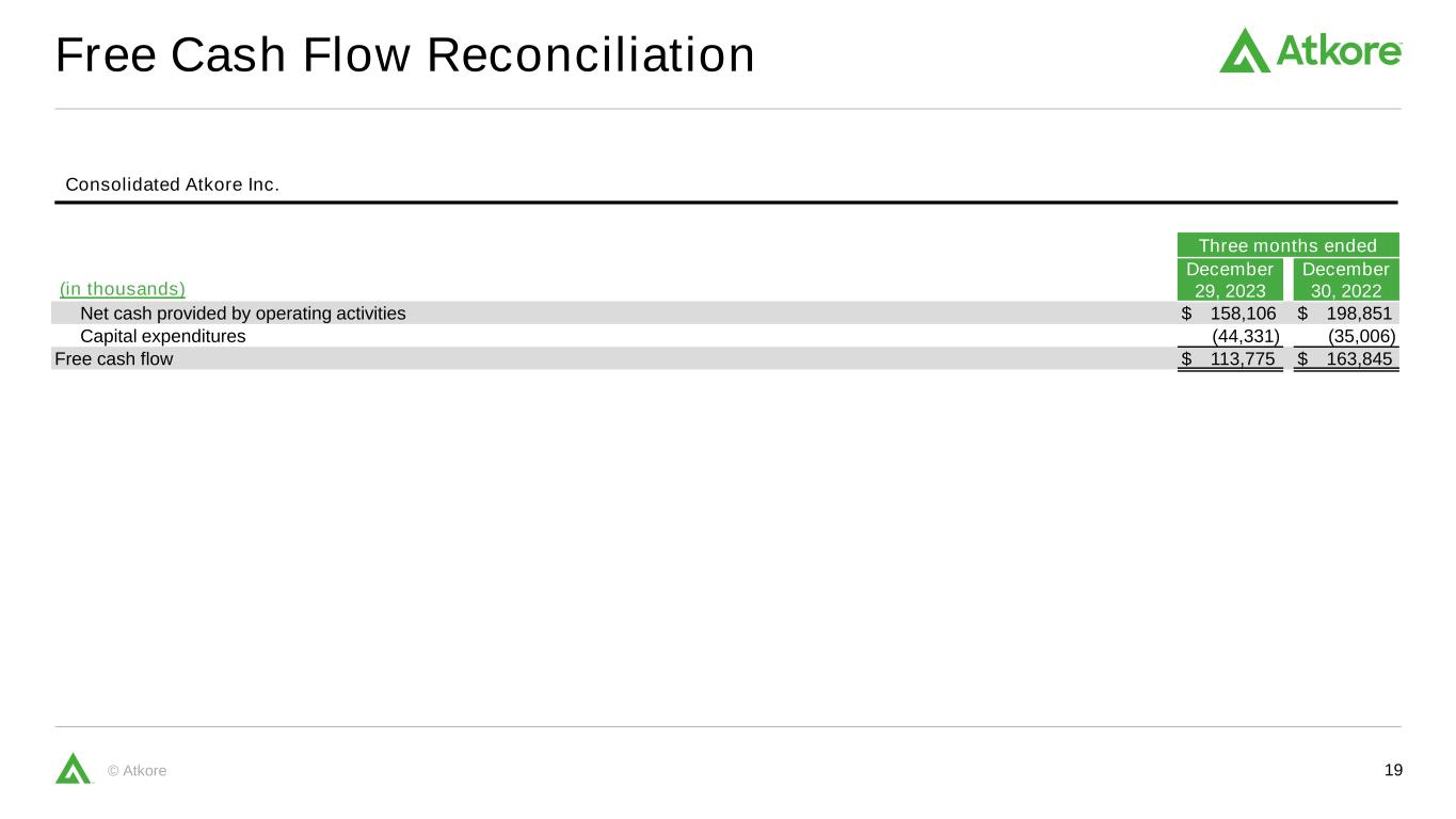 18© Atkore Total Debt to Net Debt Consolidated Atkore Inc. (in thousands) December 29, 2023 September 30, 2023 June 30, 2023 March 31, 2023 December 30, 2022 September 30, 2022 Long-term debt $ 763,225 $ 762,687 $ 762,149 $ 761,612 $ 761,074 $ 760,537 Total debt 763,225 762,687 762,149 761,612 761,074 760,537 Less cash and cash equivalents 380,922 388,114 317,809 354,342 307,827 388,751 Net debt $ 382,303 $ 374,573 $ 444,340 $ 407,270 $ 453,247 $ 371,786