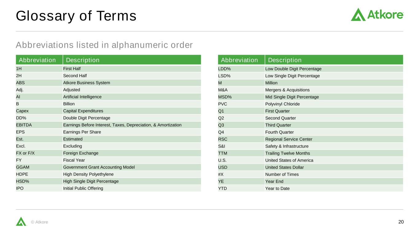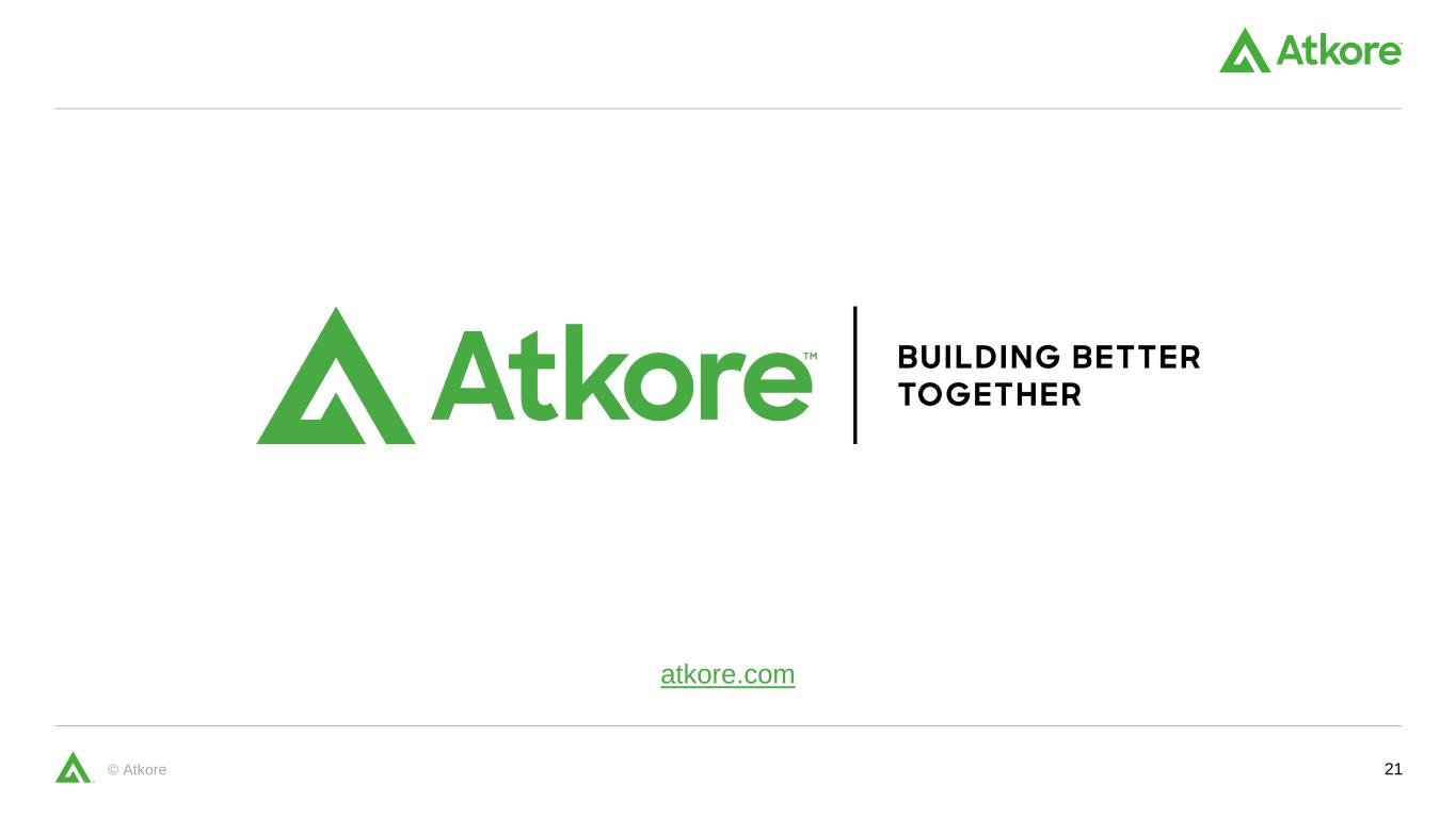 20© Atkore Abbreviations listed in alphanumeric order Glossary of Terms Abbreviation Description 1H First Half 2H Second Half ABS Atkore Business System Adj. Adjusted AI Artificial Intelligence B Billion Capex Capital Expenditures DD% Double Digit Percentage EBITDA Earnings Before Interest, Taxes, Depreciation, & Amortization EPS Earnings Per Share Est. Estimated Excl. Excluding FX or F/X Foreign Exchange FY Fiscal Year GGAM Government Grant Accounting Model HDPE High Density Polyethylene HSD% High Single Digit Percentage IPO Initial Public Offering Abbreviation Description LDD% Low Double Digit Percentage LSD% Low Single Digit Percentage M Million M&A Mergers & Acquisitions MSD% Mid Single Digit Percentage PVC Polyvinyl Chloride Q1 First Quarter Q2 Second Quarter Q3 Third Quarter Q4 Fourth Quarter RSC Regional Service Center S&I Safety & Infrastructure TTM Trailing Twelve Months U.S. United States of America USD United States Dollar #X Number of Times YE Year End YTD Year to Date