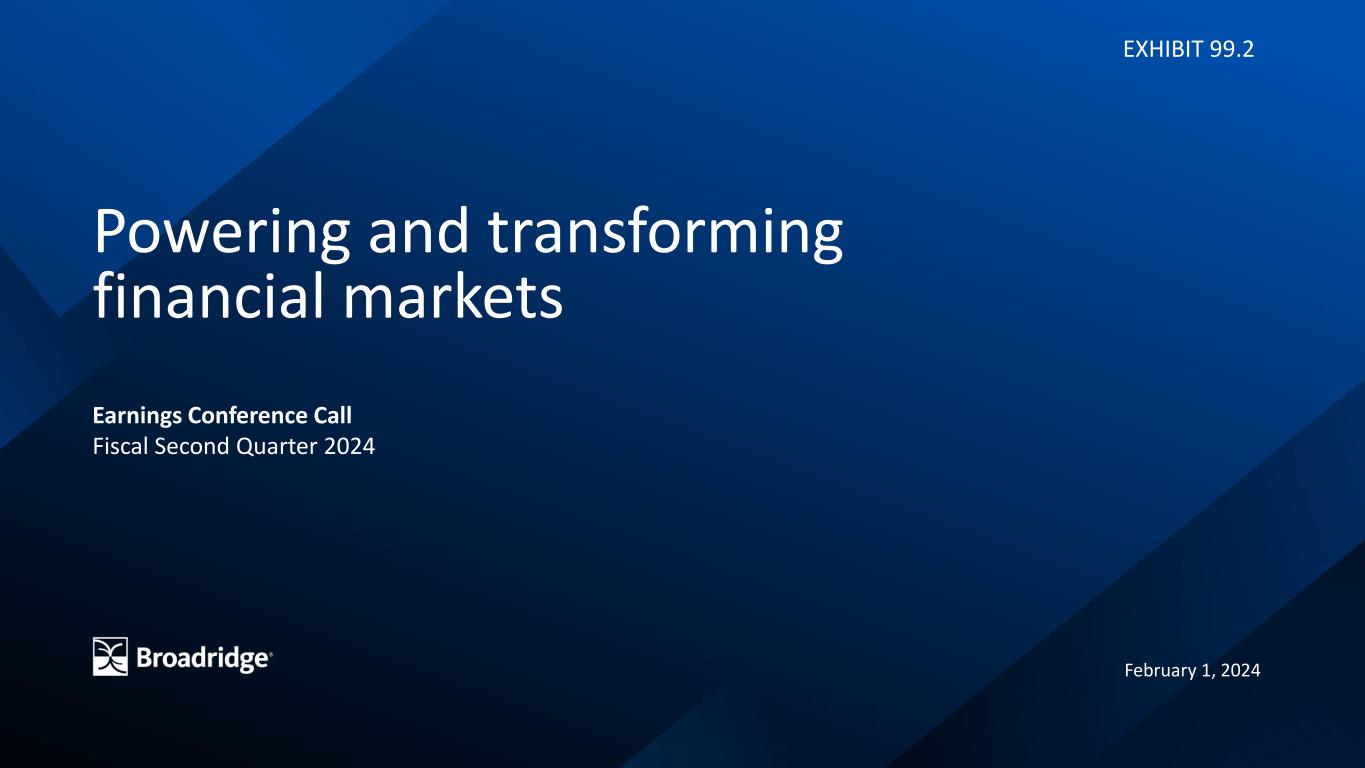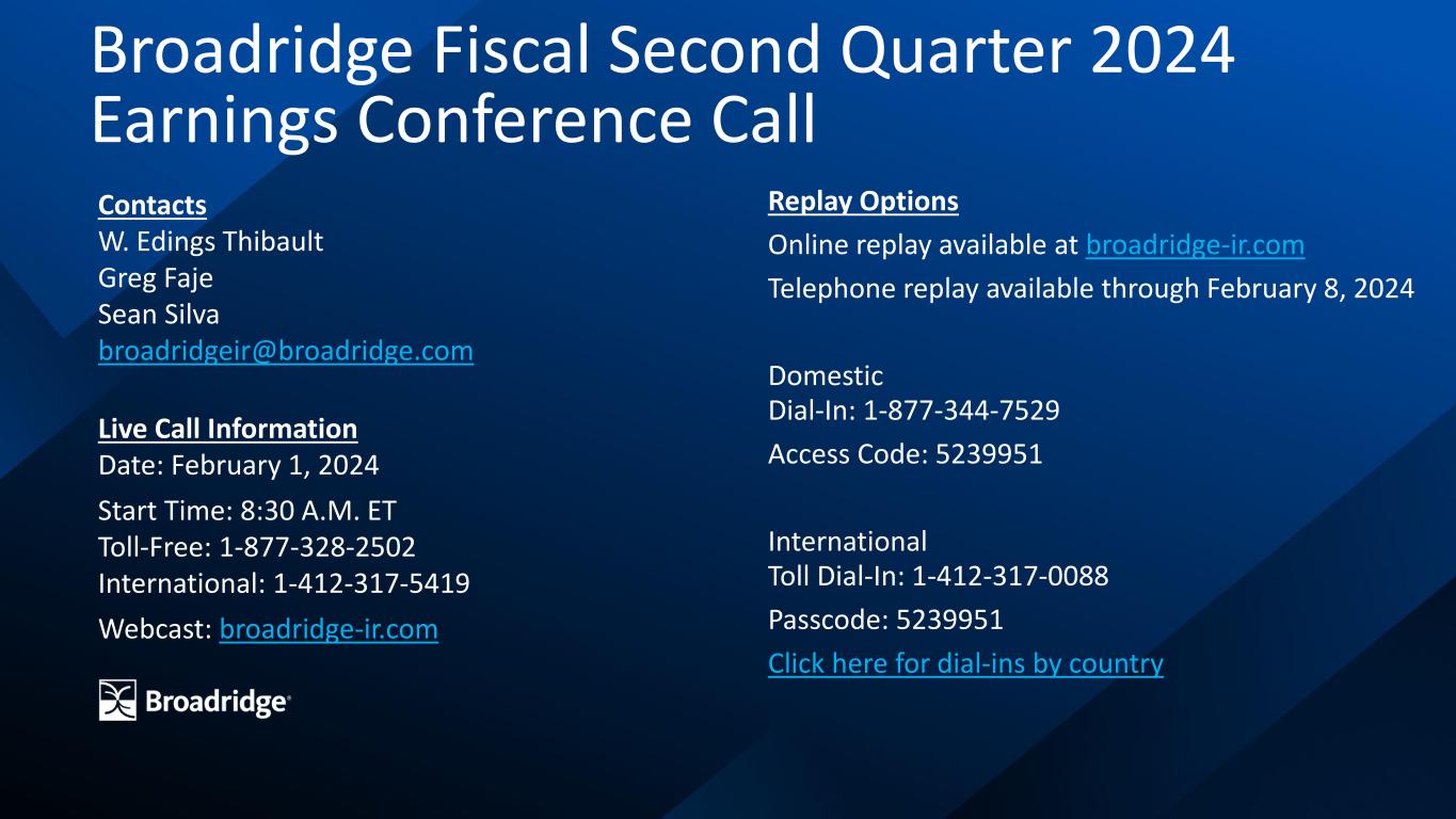 Broadridge Fiscal Second Quarter 2024 Earnings Conference Call Contacts W. Edings Thibault Greg Faje Sean Silva broadridgeir@broadridge.com Live Call Information Date: February 1, 2024 Start Time: 8:30 A.M. ET Toll-Free: 1-877-328-2502 International: 1-412-317-5419 Webcast: broadridge-ir.com Replay Options Online replay available at broadridge-ir.com Telephone replay available through February 8, 2024 Domestic Dial-In: 1-877-344-7529 Access Code: 5239951 International Toll Dial-In: 1-412-317-0088 Passcode: 5239951 Click here for dial-ins by country