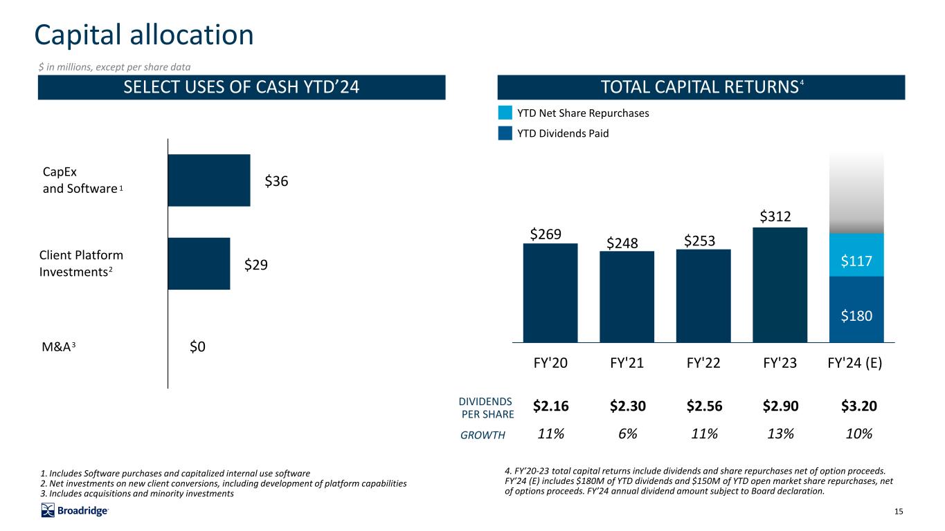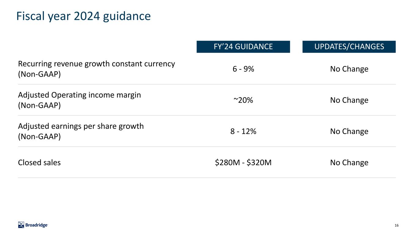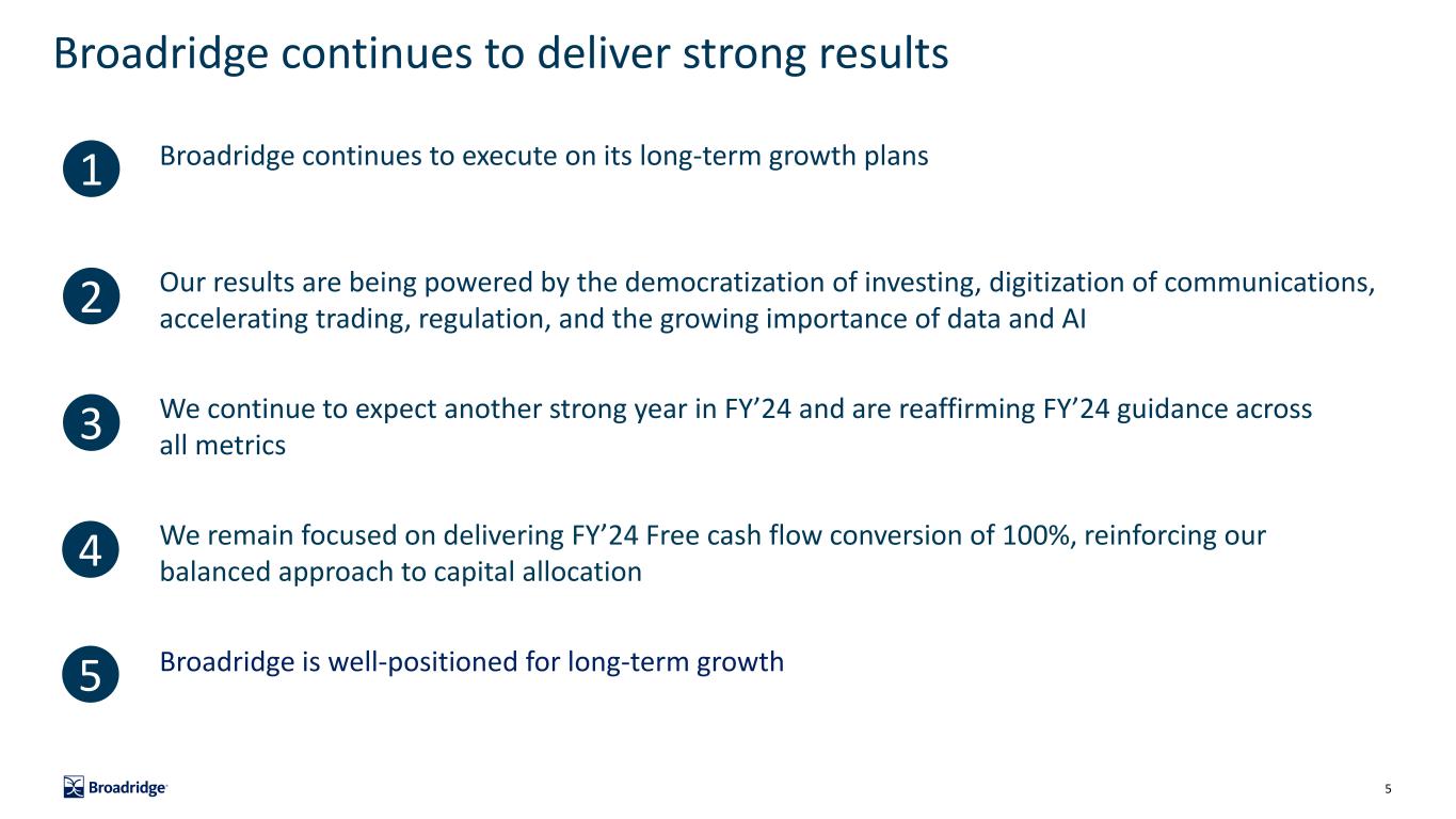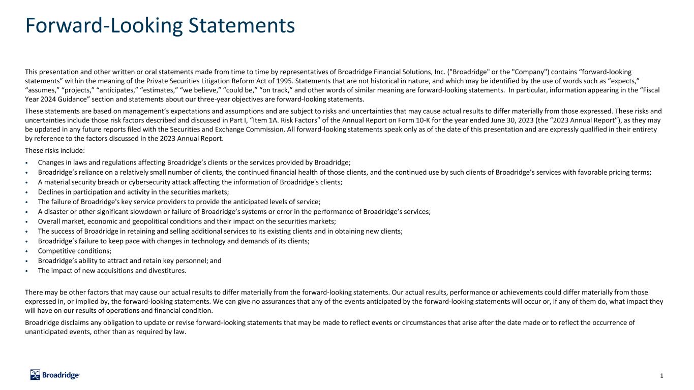 1 Forward-Looking Statements This presentation and other written or oral statements made from time to time by representatives of Broadridge Financial Solutions, Inc. ("Broadridge" or the "Company") contains “forward-looking statements” within the meaning of the Private Securities Litigation Reform Act of 1995. Statements that are not historical in nature, and which may be identified by the use of words such as “expects,” “assumes,” “projects,” “anticipates,” “estimates,” “we believe,” “could be,” “on track,” and other words of similar meaning are forward-looking statements. In particular, information appearing in the “Fiscal Year 2024 Guidance” section and statements about our three-year objectives are forward-looking statements. These statements are based on management’s expectations and assumptions and are subject to risks and uncertainties that may cause actual results to differ materially from those expressed. These risks and uncertainties include those risk factors described and discussed in Part I, “Item 1A. Risk Factors” of the Annual Report on Form 10-K for the year ended June 30, 2023 (the “2023 Annual Report”), as they may be updated in any future reports filed with the Securities and Exchange Commission. All forward-looking statements speak only as of the date of this presentation and are expressly qualified in their entirety by reference to the factors discussed in the 2023 Annual Report. These risks include: • Changes in laws and regulations affecting Broadridge’s clients or the services provided by Broadridge; • Broadridge’s reliance on a relatively small number of clients, the continued financial health of those clients, and the continued use by such clients of Broadridge’s services with favorable pricing terms; • A material security breach or cybersecurity attack affecting the information of Broadridge's clients; • Declines in participation and activity in the securities markets; • The failure of Broadridge's key service providers to provide the anticipated levels of service; • A disaster or other significant slowdown or failure of Broadridge’s systems or error in the performance of Broadridge’s services; • Overall market, economic and geopolitical conditions and their impact on the securities markets; • The success of Broadridge in retaining and selling additional services to its existing clients and in obtaining new clients; • Broadridge’s failure to keep pace with changes in technology and demands of its clients; • Competitive conditions; • Broadridge’s ability to attract and retain key personnel; and • The impact of new acquisitions and divestitures. There may be other factors that may cause our actual results to differ materially from the forward-looking statements. Our actual results, performance or achievements could differ materially from those expressed in, or implied by, the forward-looking statements. We can give no assurances that any of the events anticipated by the forward-looking statements will occur or, if any of them do, what impact they will have on our results of operations and financial condition. Broadridge disclaims any obligation to update or revise forward-looking statements that may be made to reflect events or circumstances that arise after the date made or to reflect the occurrence of unanticipated events, other than as required by law.