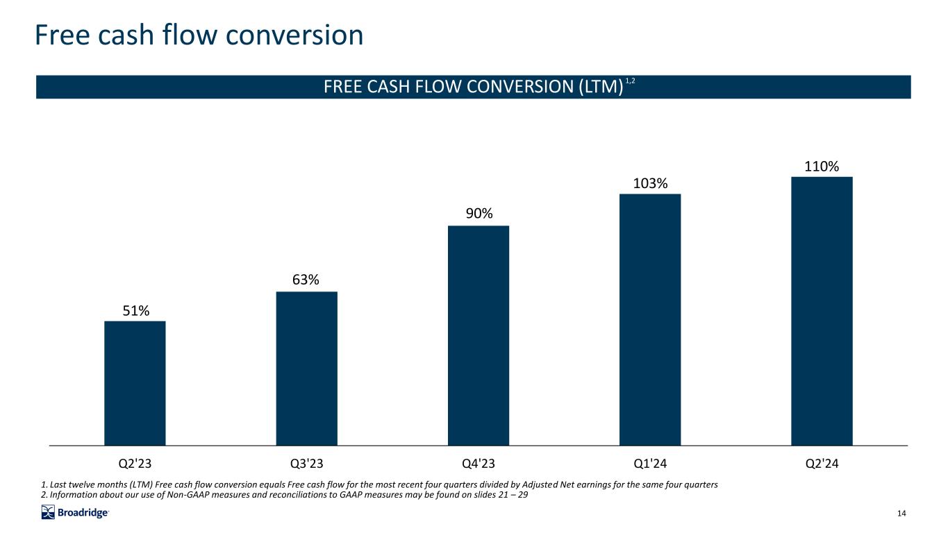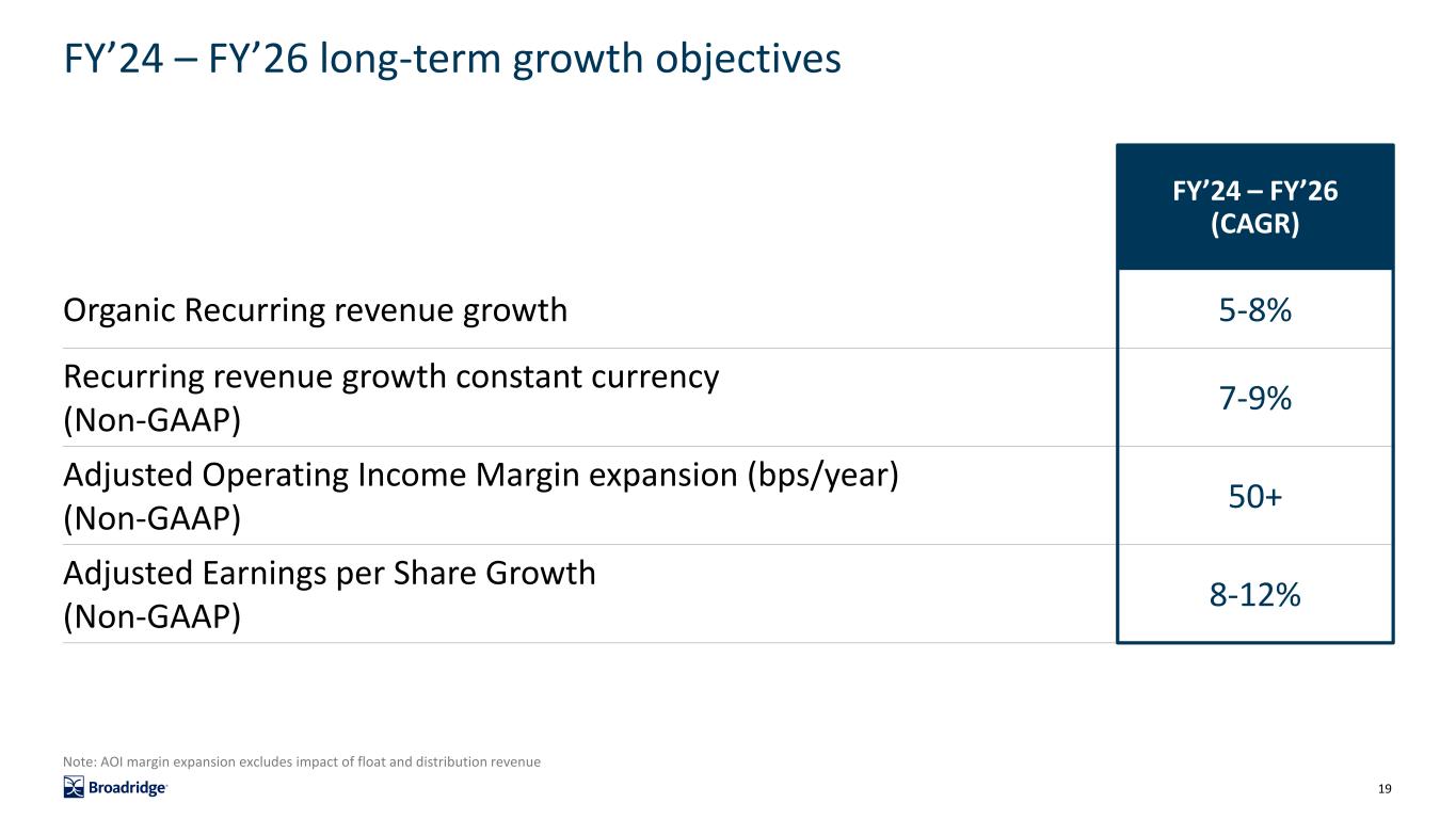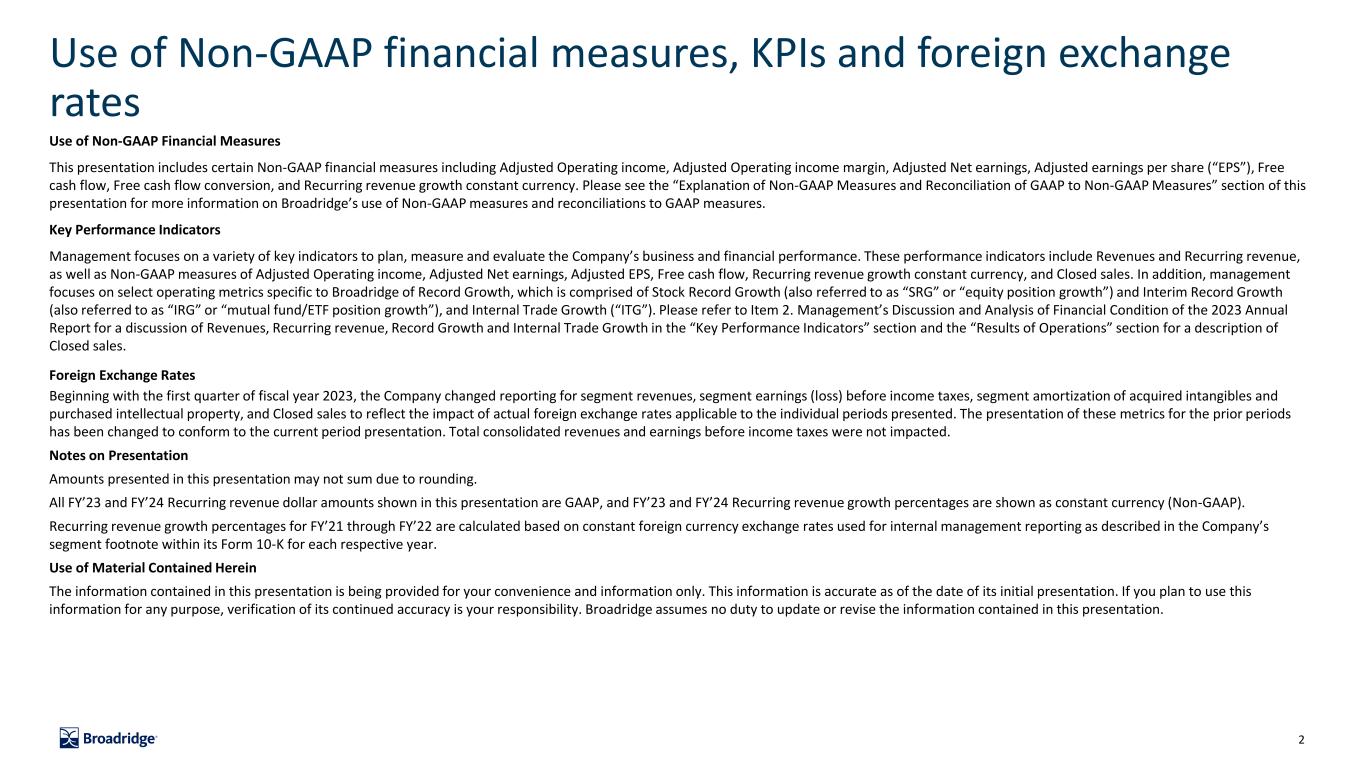 2 Use of Non-GAAP financial measures, KPIs and foreign exchange rates Use of Non-GAAP Financial Measures This presentation includes certain Non-GAAP financial measures including Adjusted Operating income, Adjusted Operating income margin, Adjusted Net earnings, Adjusted earnings per share (“EPS”), Free cash flow, Free cash flow conversion, and Recurring revenue growth constant currency. Please see the “Explanation of Non-GAAP Measures and Reconciliation of GAAP to Non-GAAP Measures” section of this presentation for more information on Broadridge’s use of Non-GAAP measures and reconciliations to GAAP measures. Key Performance Indicators Management focuses on a variety of key indicators to plan, measure and evaluate the Company’s business and financial performance. These performance indicators include Revenues and Recurring revenue, as well as Non-GAAP measures of Adjusted Operating income, Adjusted Net earnings, Adjusted EPS, Free cash flow, Recurring revenue growth constant currency, and Closed sales. In addition, management focuses on select operating metrics specific to Broadridge of Record Growth, which is comprised of Stock Record Growth (also referred to as “SRG” or “equity position growth”) and Interim Record Growth (also referred to as “IRG” or “mutual fund/ETF position growth”), and Internal Trade Growth (“ITG”). Please refer to Item 2. Management’s Discussion and Analysis of Financial Condition of the 2023 Annual Report for a discussion of Revenues, Recurring revenue, Record Growth and Internal Trade Growth in the “Key Performance Indicators” section and the “Results of Operations” section for a description of Closed sales. Foreign Exchange Rates Beginning with the first quarter of fiscal year 2023, the Company changed reporting for segment revenues, segment earnings (loss) before income taxes, segment amortization of acquired intangibles and purchased intellectual property, and Closed sales to reflect the impact of actual foreign exchange rates applicable to the individual periods presented. The presentation of these metrics for the prior periods has been changed to conform to the current period presentation. Total consolidated revenues and earnings before income taxes were not impacted. Notes on Presentation Amounts presented in this presentation may not sum due to rounding. All FY’23 and FY’24 Recurring revenue dollar amounts shown in this presentation are GAAP, and FY’23 and FY’24 Recurring revenue growth percentages are shown as constant currency (Non-GAAP). Recurring revenue growth percentages for FY’21 through FY’22 are calculated based on constant foreign currency exchange rates used for internal management reporting as described in the Company’s segment footnote within its Form 10-K for each respective year. Use of Material Contained Herein The information contained in this presentation is being provided for your convenience and information only. This information is accurate as of the date of its initial presentation. If you plan to use this information for any purpose, verification of its continued accuracy is your responsibility. Broadridge assumes no duty to update or revise the information contained in this presentation.