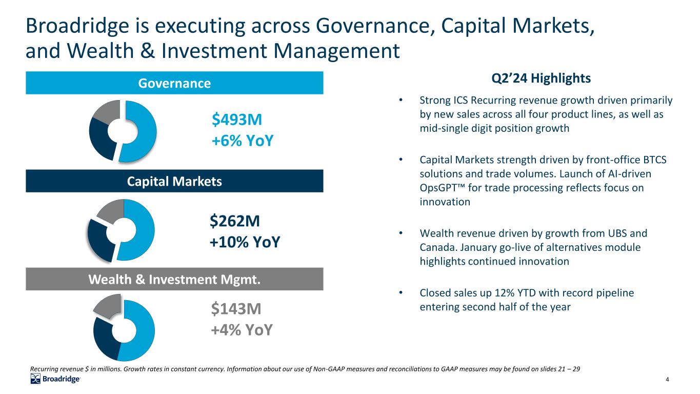 3 Key messages Broadridge’s second quarter results, powered by 6% Recurring revenue growth constant currency, mark another step forward towards our long-term growth objectives Our growth continues to be driven by long-term trends, including equity position growth of 6% and mutual fund/ETF position growth of 5% Broadridge continues to execute on our long-term growth strategy of driving democratization and digitization, simplifying and innovating trading, and modernizing wealth management Our strong Q2’24 Free cash flow has Broadridge on-track to achieve its objective of 100% Free cash flow conversion and return capital to shareholders We are reaffirming our FY’24 guidance, including 6-9% Recurring revenue growth constant currency, 8-12% Adjusted EPS growth, and strong Closed sales, and are on-track to achieve our FY’24-26 Investor Day growth objectives 1 2 3 4 5