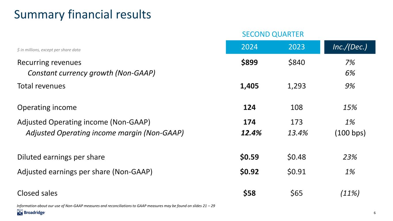 NEW YORK, N.Y., February 1, 2024 - Broadridge Financial Solutions, Inc. (NYSE:BR) today reported financial results for the second quarter ended December 31, 2023 of its fiscal year 2024. Results compared with the same period last year were as follows: | | | | | | | | | | | | | | | | | | | | | | | |