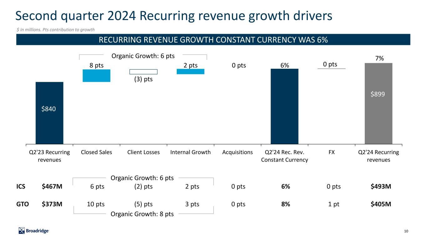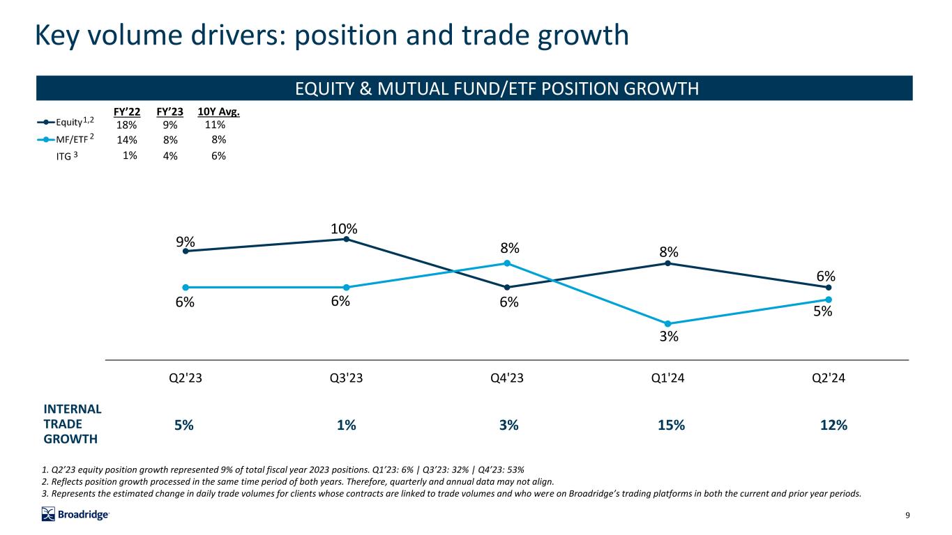 9 9% 10% 6% 8% 6% 6% 6% 8% 3% 5% Q2'23 Q3'23 Q4'23 Q1'24 Q2'24 Key volume drivers: position and trade growth 5% 1% 3% 15% 12% INTERNAL TRADE GROWTH EQUITY & MUTUAL FUND/ETF POSITION GROWTH 1. Q2’23 equity position growth represented 9% of total fiscal year 2023 positions. Q1’23: 6% | Q3’23: 32% | Q4’23: 53% 2. Reflects position growth processed in the same time period of both years. Therefore, quarterly and annual data may not align. 3. Represents the estimated change in daily trade volumes for clients whose contracts are linked to trade volumes and who were on Broadridge’s trading platforms in both the current and prior year periods. ITG 3 FY’22 FY’23 9% 8% 18% 14% 4%1% 11% 10Y Avg. 8% 6% 2 1,2