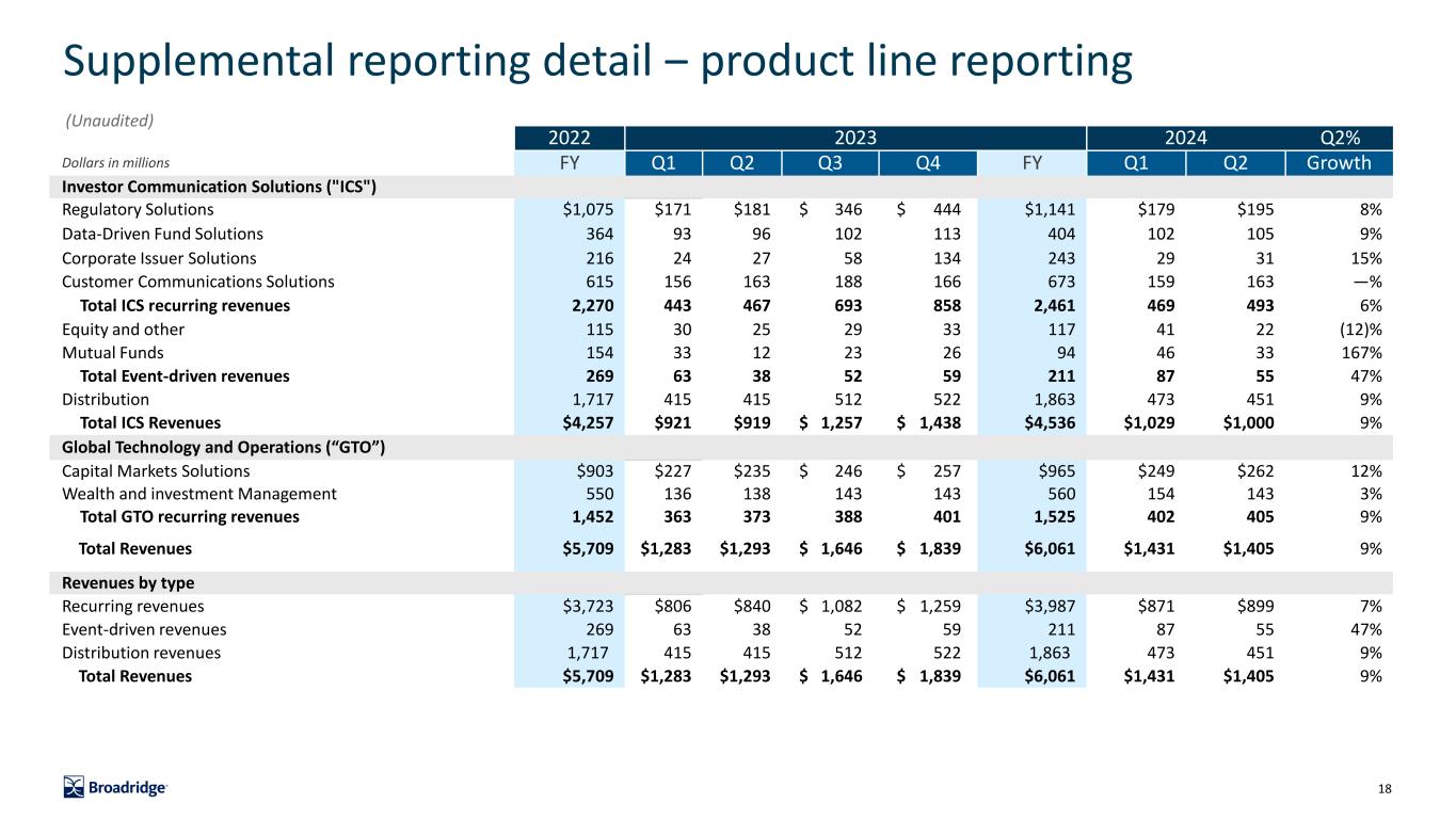 18 Supplemental reporting detail ‒ product line reporting (Unaudited) 2022 2023 2024 Q2% Dollars in millions FY Q1 Q2 Q3 Q4 FY Q1 Q2 Growth Investor Communication Solutions ("ICS") Regulatory Solutions $1,075 $171 $181 $ 346 $ 444 $1,141 $179 $195 8% Data-Driven Fund Solutions 364 93 96 102 113 404 102 105 9% Corporate Issuer Solutions 216 24 27 58 134 243 29 31 15% Customer Communications Solutions 615 156 163 188 166 673 159 163 —% Total ICS recurring revenues 2,270 443 467 693 858 2,461 469 493 6% Equity and other 115 30 25 29 33 117 41 22 (12)% Mutual Funds 154 33 12 23 26 94 46 33 167% Total Event-driven revenues 269 63 38 52 59 211 87 55 47% Distribution 1,717 415 415 512 522 1,863 473 451 9% Total ICS Revenues $4,257 $921 $919 $ 1,257 $ 1,438 $4,536 $1,029 $1,000 9% Global Technology and Operations (“GTO”) Capital Markets Solutions $903 $227 $235 $ 246 $ 257 $965 $249 $262 12% Wealth and investment Management 550 136 138 143 143 560 154 143 3% Total GTO recurring revenues 1,452 363 373 388 401 1,525 402 405 9% Total Revenues $5,709 $1,283 $1,293 $ 1,646 $ 1,839 $6,061 $1,431 $1,405 9% Revenues by type Recurring revenues $3,723 $806 $840 $ 1,082 $ 1,259 $3,987 $871 $899 7% Event-driven revenues 269 63 38 52 59 211 87 55 47% Distribution revenues 1,717 415 415 512 522 1,863 473 451 9% Total Revenues $5,709 $1,283 $1,293 $ 1,646 $ 1,839 $6,061 $1,431 $1,405 9%