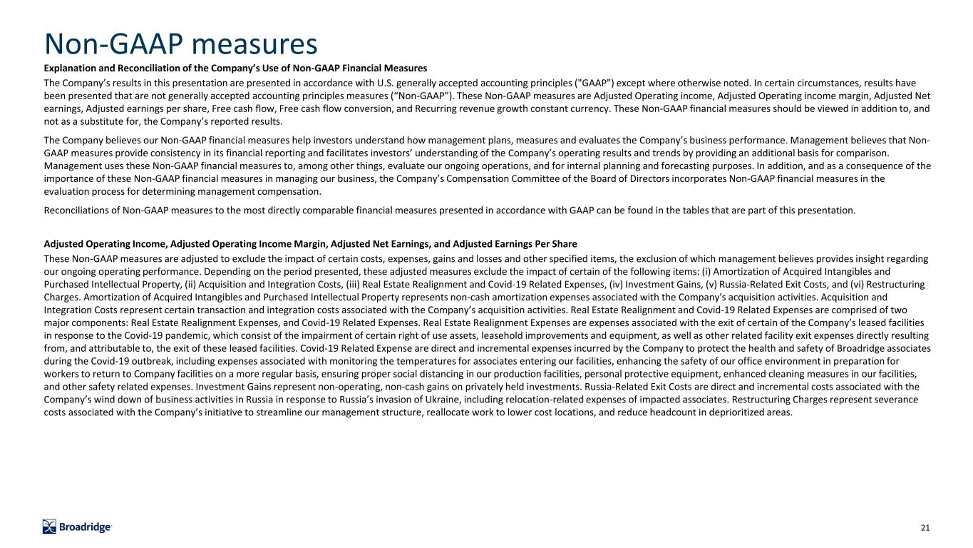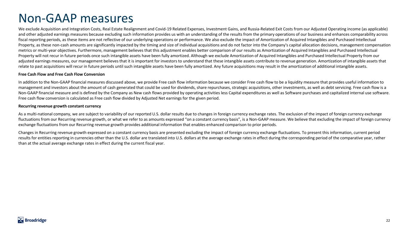 21 Non-GAAP measures Explanation and Reconciliation of the Company’s Use of Non-GAAP Financial Measures The Company’s results in this presentation are presented in accordance with U.S. generally accepted accounting principles ("GAAP") except where otherwise noted. In certain circumstances, results have been presented that are not generally accepted accounting principles measures (“Non-GAAP”). These Non-GAAP measures are Adjusted Operating income, Adjusted Operating income margin, Adjusted Net earnings, Adjusted earnings per share, Free cash flow, Free cash flow conversion, and Recurring revenue growth constant currency. These Non-GAAP financial measures should be viewed in addition to, and not as a substitute for, the Company’s reported results. The Company believes our Non-GAAP financial measures help investors understand how management plans, measures and evaluates the Company’s business performance. Management believes that Non- GAAP measures provide consistency in its financial reporting and facilitates investors’ understanding of the Company’s operating results and trends by providing an additional basis for comparison. Management uses these Non-GAAP financial measures to, among other things, evaluate our ongoing operations, and for internal planning and forecasting purposes. In addition, and as a consequence of the importance of these Non-GAAP financial measures in managing our business, the Company’s Compensation Committee of the Board of Directors incorporates Non-GAAP financial measures in the evaluation process for determining management compensation. Reconciliations of Non-GAAP measures to the most directly comparable financial measures presented in accordance with GAAP can be found in the tables that are part of this presentation. Adjusted Operating Income, Adjusted Operating Income Margin, Adjusted Net Earnings, and Adjusted Earnings Per Share These Non-GAAP measures are adjusted to exclude the impact of certain costs, expenses, gains and losses and other specified items, the exclusion of which management believes provides insight regarding our ongoing operating performance. Depending on the period presented, these adjusted measures exclude the impact of certain of the following items: (i) Amortization of Acquired Intangibles and Purchased Intellectual Property, (ii) Acquisition and Integration Costs, (iii) Real Estate Realignment and Covid-19 Related Expenses, (iv) Investment Gains, (v) Russia-Related Exit Costs, and (vi) Restructuring Charges. Amortization of Acquired Intangibles and Purchased Intellectual Property represents non-cash amortization expenses associated with the Company's acquisition activities. Acquisition and Integration Costs represent certain transaction and integration costs associated with the Company’s acquisition activities. Real Estate Realignment and Covid-19 Related Expenses are comprised of two major components: Real Estate Realignment Expenses, and Covid-19 Related Expenses. Real Estate Realignment Expenses are expenses associated with the exit of certain of the Company’s leased facilities in response to the Covid-19 pandemic, which consist of the impairment of certain right of use assets, leasehold improvements and equipment, as well as other related facility exit expenses directly resulting from, and attributable to, the exit of these leased facilities. Covid-19 Related Expense are direct and incremental expenses incurred by the Company to protect the health and safety of Broadridge associates during the Covid-19 outbreak, including expenses associated with monitoring the temperatures for associates entering our facilities, enhancing the safety of our office environment in preparation for workers to return to Company facilities on a more regular basis, ensuring proper social distancing in our production facilities, personal protective equipment, enhanced cleaning measures in our facilities, and other safety related expenses. Investment Gains represent non-operating, non-cash gains on privately held investments. Russia-Related Exit Costs are direct and incremental costs associated with the Company’s wind down of business activities in Russia in response to Russia’s invasion of Ukraine, including relocation-related expenses of impacted associates. Restructuring Charges represent severance costs associated with the Company’s initiative to streamline our management structure, reallocate work to lower cost locations, and reduce headcount in deprioritized areas.