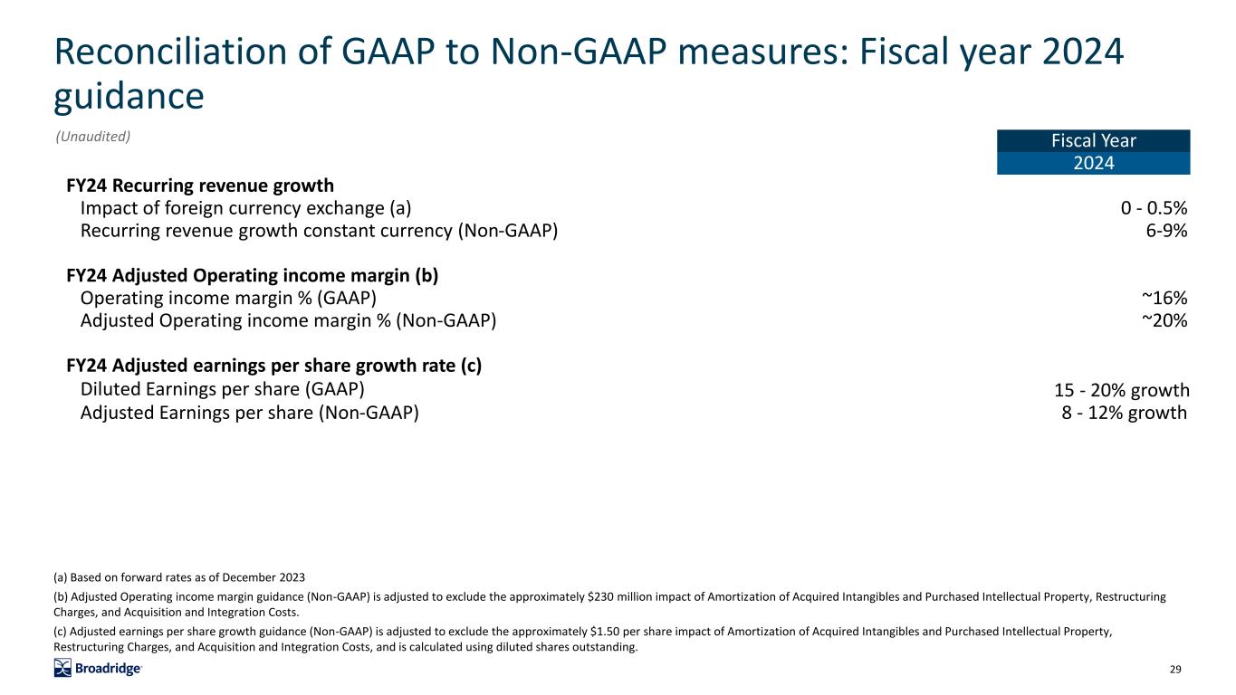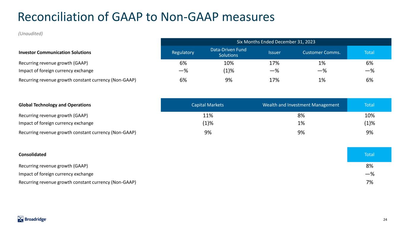 23 Reconciliation of GAAP to Non-GAAP measures (Unaudited) Global Technology and Operations Capital Markets Wealth and Investment Management Total Recurring revenue growth (GAAP) 12% 3% 9% Impact of foreign currency exchange (2)% —% (1)% Recurring revenue growth constant currency (Non-GAAP) 10% 4% 8% Three Months Ended December 31, 2023 Investor Communication Solutions Regulatory Data-Driven Fund Solutions Issuer Customer Comms. Total Recurring revenue growth (GAAP) 8% 9% 15% —% 6% Impact of foreign currency exchange —% (1)% —% —% —% Recurring revenue growth constant currency (Non-GAAP) 8% 9% 15% —% 6% Consolidated Total Recurring revenue growth (GAAP) 7% Impact of foreign currency exchange —% Recurring revenue growth constant currency (Non-GAAP) 6%