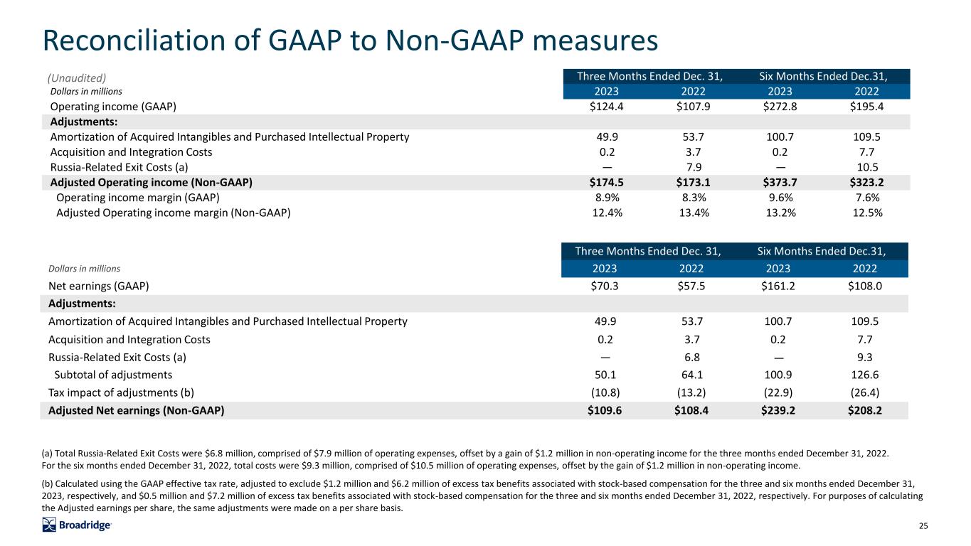 25 Reconciliation of GAAP to Non-GAAP measures (Unaudited) Three Months Ended Dec. 31, Six Months Ended Dec.31, Dollars in millions 2023 2022 2023 2022 Operating income (GAAP) $124.4 $107.9 $272.8 $195.4 Adjustments: Amortization of Acquired Intangibles and Purchased Intellectual Property 49.9 53.7 100.7 109.5 Acquisition and Integration Costs 0.2 3.7 0.2 7.7 Russia-Related Exit Costs (a) — 7.9 — 10.5 Adjusted Operating income (Non-GAAP) $174.5 $173.1 $373.7 $323.2 Operating income margin (GAAP) 8.9% 8.3% 9.6% 7.6% Adjusted Operating income margin (Non-GAAP) 12.4% 13.4% 13.2% 12.5% Three Months Ended Dec. 31, Six Months Ended Dec.31, Dollars in millions 2023 2022 2023 2022 Net earnings (GAAP) $70.3 $57.5 $161.2 $108.0 Adjustments: Amortization of Acquired Intangibles and Purchased Intellectual Property 49.9 53.7 100.7 109.5 Acquisition and Integration Costs 0.2 3.7 0.2 7.7 Russia-Related Exit Costs (a) — 6.8 — 9.3 Subtotal of adjustments 50.1 64.1 100.9 126.6 Tax impact of adjustments (b) (10.8) (13.2) (22.9) (26.4) Adjusted Net earnings (Non-GAAP) $109.6 $108.4 $239.2 $208.2 (a) Total Russia-Related Exit Costs were $6.8 million, comprised of $7.9 million of operating expenses, offset by a gain of $1.2 million in non-operating income for the three months ended December 31, 2022. For the six months ended December 31, 2022, total costs were $9.3 million, comprised of $10.5 million of operating expenses, offset by the gain of $1.2 million in non-operating income. (b) Calculated using the GAAP effective tax rate, adjusted to exclude $1.2 million and $6.2 million of excess tax benefits associated with stock-based compensation for the three and six months ended December 31, 2023, respectively, and $0.5 million and $7.2 million of excess tax benefits associated with stock-based compensation for the three and six months ended December 31, 2022, respectively. For purposes of calculating the Adjusted earnings per share, the same adjustments were made on a per share basis.