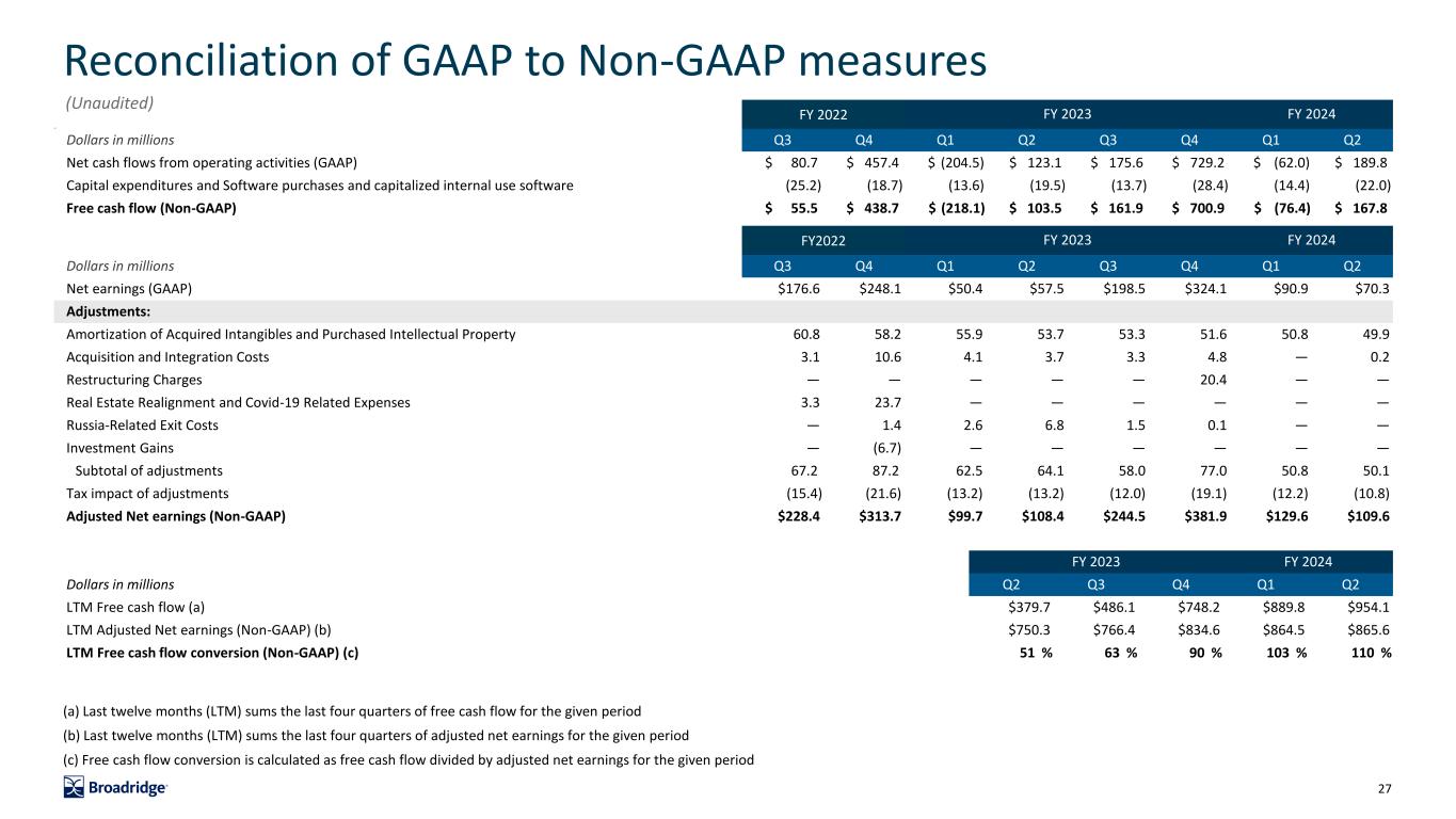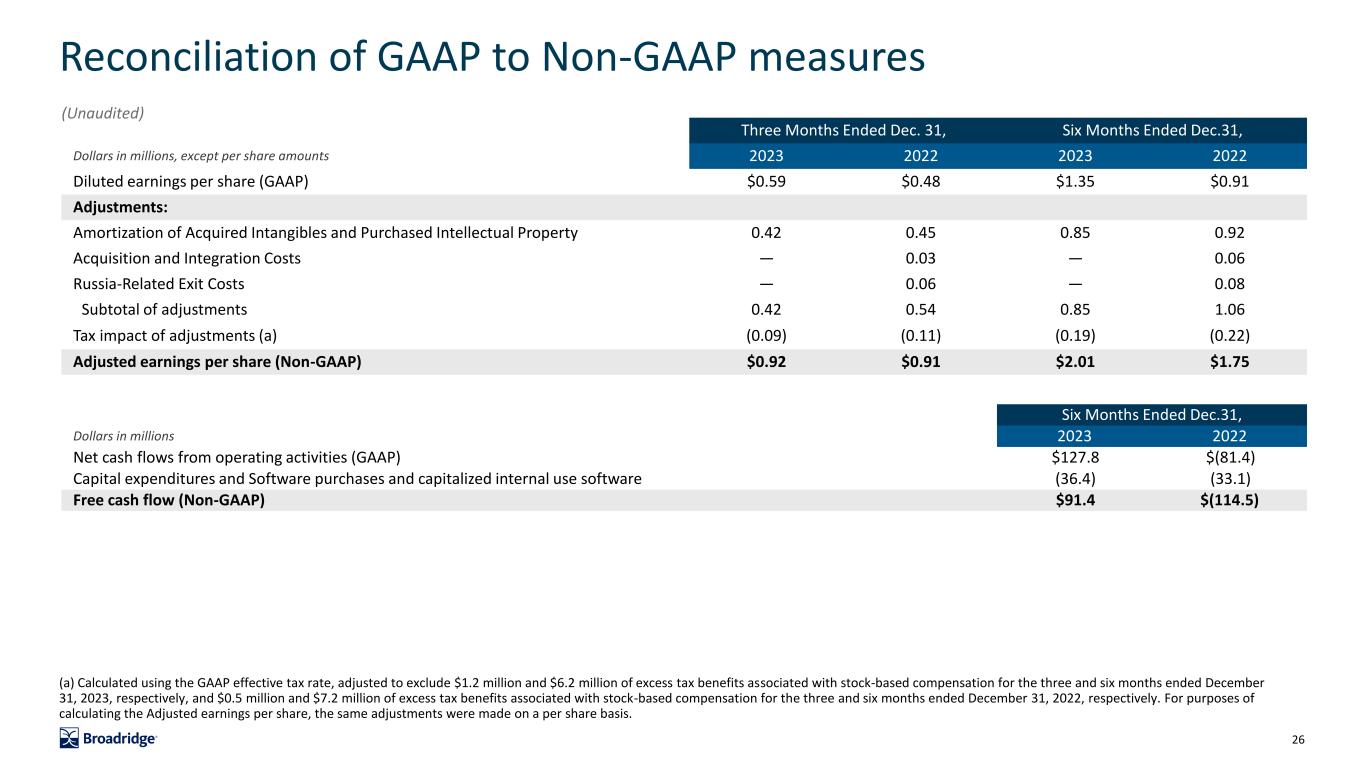 26 Reconciliation of GAAP to Non-GAAP measures (Unaudited) (a) Calculated using the GAAP effective tax rate, adjusted to exclude $1.2 million and $6.2 million of excess tax benefits associated with stock-based compensation for the three and six months ended December 31, 2023, respectively, and $0.5 million and $7.2 million of excess tax benefits associated with stock-based compensation for the three and six months ended December 31, 2022, respectively. For purposes of calculating the Adjusted earnings per share, the same adjustments were made on a per share basis. Three Months Ended Dec. 31, Six Months Ended Dec.31, Dollars in millions, except per share amounts 2023 2022 2023 2022 Diluted earnings per share (GAAP) $0.59 $0.48 $1.35 $0.91 Adjustments: Amortization of Acquired Intangibles and Purchased Intellectual Property 0.42 0.45 0.85 0.92 Acquisition and Integration Costs — 0.03 — 0.06 Russia-Related Exit Costs — 0.06 — 0.08 Subtotal of adjustments 0.42 0.54 0.85 1.06 Tax impact of adjustments (a) (0.09) (0.11) (0.19) (0.22) Adjusted earnings per share (Non-GAAP) $0.92 $0.91 $2.01 $1.75 Six Months Ended Dec.31, Dollars in millions 2023 2022 Net cash flows from operating activities (GAAP) $127.8 $(81.4) Capital expenditures and Software purchases and capitalized internal use software (36.4) (33.1) Free cash flow (Non-GAAP) $91.4 $(114.5)