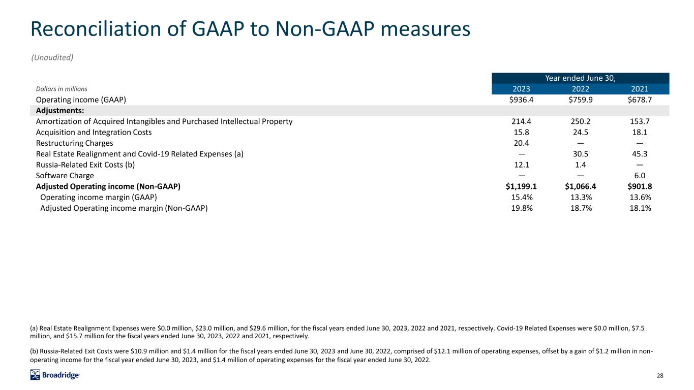 28 Reconciliation of GAAP to Non-GAAP measures (Unaudited) (a) Real Estate Realignment Expenses were $0.0 million, $23.0 million, and $29.6 million, for the fiscal years ended June 30, 2023, 2022 and 2021, respectively. Covid-19 Related Expenses were $0.0 million, $7.5 million, and $15.7 million for the fiscal years ended June 30, 2023, 2022 and 2021, respectively. (b) Russia-Related Exit Costs were $10.9 million and $1.4 million for the fiscal years ended June 30, 2023 and June 30, 2022, comprised of $12.1 million of operating expenses, offset by a gain of $1.2 million in non- operating income for the fiscal year ended June 30, 2023, and $1.4 million of operating expenses for the fiscal year ended June 30, 2022. Year ended June 30, Dollars in millions 2023 2022 2021 Operating income (GAAP) $936.4 $759.9 $678.7 Adjustments: Amortization of Acquired Intangibles and Purchased Intellectual Property 214.4 250.2 153.7 Acquisition and Integration Costs 15.8 24.5 18.1 Restructuring Charges 20.4 — — Real Estate Realignment and Covid-19 Related Expenses (a) — 30.5 45.3 Russia-Related Exit Costs (b) 12.1 1.4 — Software Charge — — 6.0 Adjusted Operating income (Non-GAAP) $1,199.1 $1,066.4 $901.8 Operating income margin (GAAP) 15.4% 13.3% 13.6% Adjusted Operating income margin (Non-GAAP) 19.8% 18.7% 18.1%