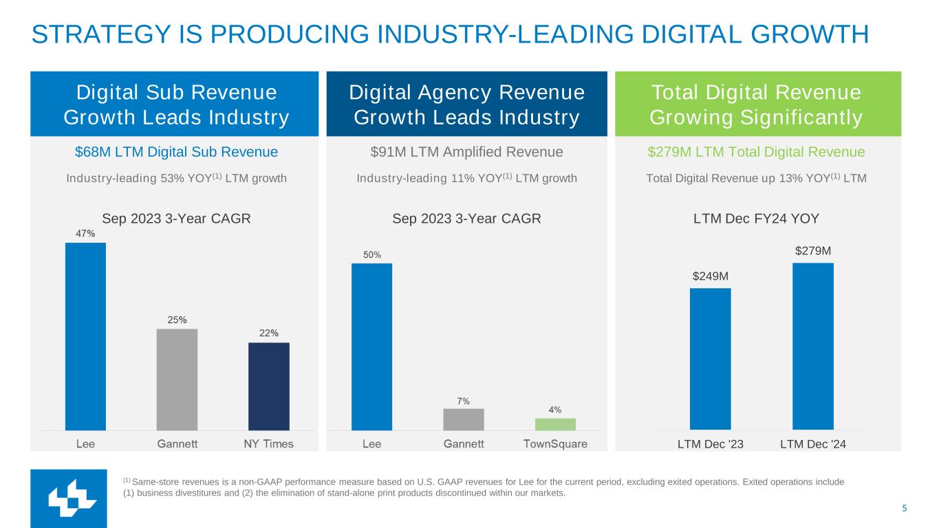 4 LEE’S STRATEGY FOR DIGITAL TRANSFORMATION: THE THREE PILLARS LEE IS RAPIDLY TRANSFORMING FROM A PRINT-CENTRIC TO A DIGITAL-CENTRIC COMPANY PILLAR 1 Expand our audience by providing compelling local content PILLAR 2 Accelerate digital subscription growth PILLAR 3 Diversify and expand offerings for local advertisers Lee expects the Three Pillar Digital Growth Strategy to drive more than $450 million of digital revenue within five years, resulting in a business that is sustainable and vibrant from solely our digital products