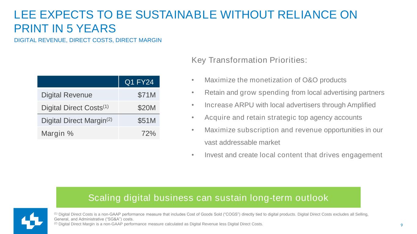 8 FIRST QUARTER 2024 RESULTS Q1 Revenue (1) Same-store revenues is a non-GAAP performance measure based on U.S. GAAP revenues for Lee for the current period, excluding exited operations. Exited operations include (1) business divestitures and (2) the elimination of stand-alone print products discontinued within our markets. (2) Adjusted EBITDA and Cash Costs are non-GAAP financial measures. See appendix. Total Digital Revenue $71M, +11% YOY on a Same-store basis(1) • Digital subscription revenue $19M, +60%(1) • Digital advertising revenue $46M, -1%(1) • Amplified Digital® revenue $21M, +4%(1) Total Print Revenue $85M, -24%(1) Total Operating Revenue $156M, -11%(1) Q1 Cash Costs(2) • Total Cash Costs $139M, -18% Q1 Adjusted EBITDA(2) • Adjusted EBITDA $19M, +6% Continued digital revenue growth Strong cost control of legacy business Investments to drive digital transformation Adj. EBITDA growth
