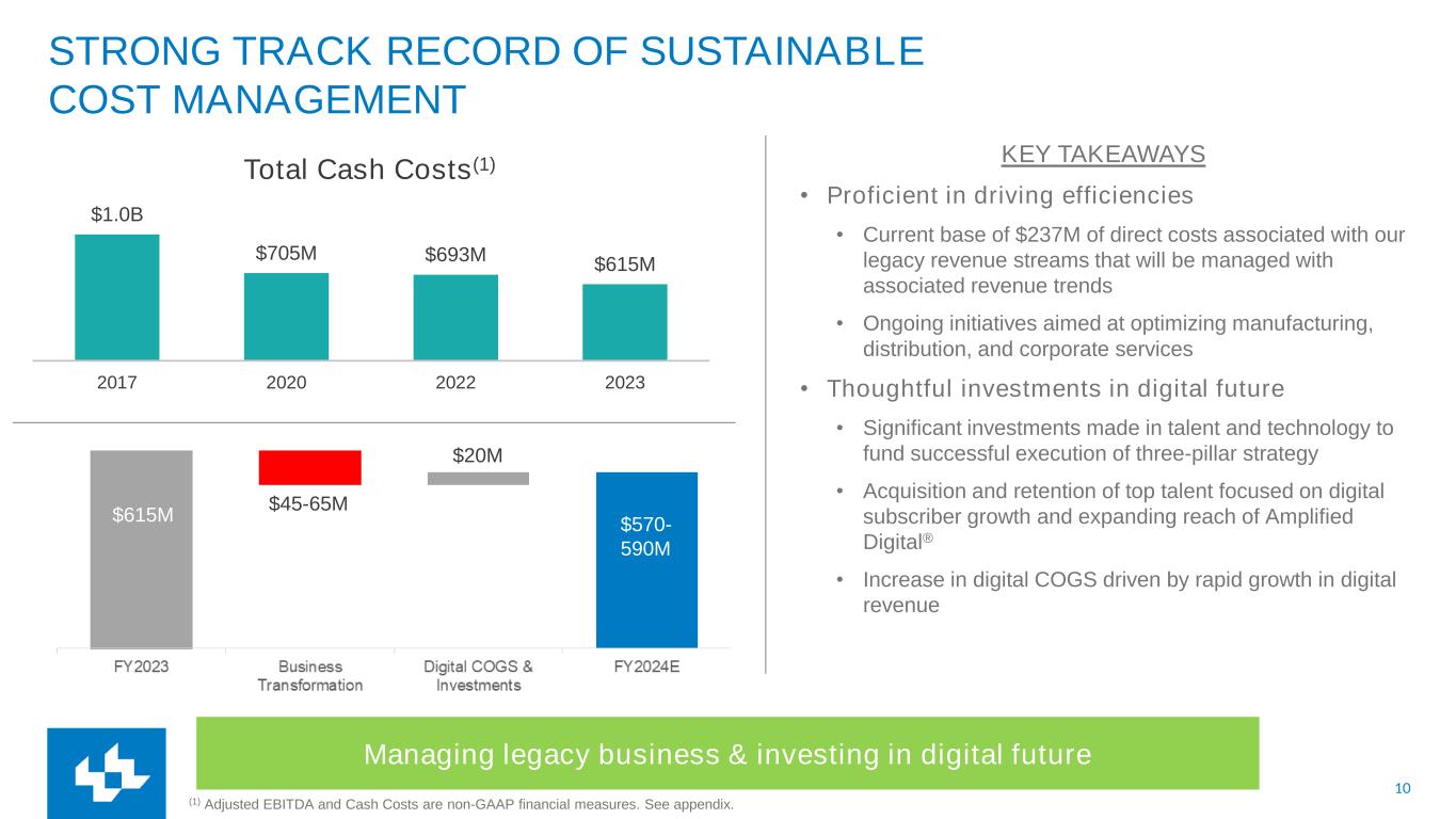 9 LEE EXPECTS TO BE SUSTAINABLE WITHOUT RELIANCE ON PRINT IN 5 YEARS Scaling digital business can sustain long-term outlook Key Transformation Priorities: • Maximize the monetization of O&O products • Retain and grow spending from local advertising partners • Increase ARPU with local advertisers through Amplified • Acquire and retain strategic top agency accounts • Maximize subscription and revenue opportunities in our vast addressable market • Invest and create local content that drives engagement Q1 FY24 Digital Revenue $71M Digital Direct Costs(1) $20M Digital Direct Margin(2) $51M Margin % 72% (1) Digital Direct Costs is a non-GAAP performance measure that includes Cost of Goods Sold (“COGS”) directly tied to digital products. Digital Direct Costs excludes all Selling, General, and Administrative (“SG&A”) costs. (2) Digital Direct Margin is a non-GAAP performance measure calculated as Digital Revenue less Digital Direct Costs. DIGITAL REVENUE, DIRECT COSTS, DIRECT MARGIN