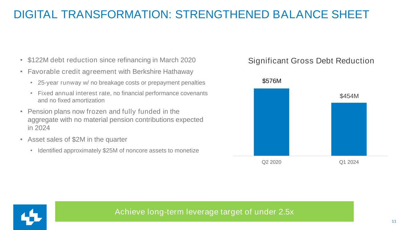 11 Q2 2020 Q1 2024 DIGITAL TRANSFORMATION: STRENGTHENED BALANCE SHEET • $122M debt reduction since refinancing in March 2020 • Favorable credit agreement with Berkshire Hathaway • 25-year runway w/ no breakage costs or prepayment penalties • Fixed annual interest rate, no financial performance covenants and no fixed amortization • Pension plans now frozen and fully funded in the aggregate with no material pension contributions expected in 2024 • Asset sales of $2M in the quarter • Identified approximately $25M of noncore assets to monetize Achieve long-term leverage target of under 2.5x $576M $454M Significant Gross Debt Reduction