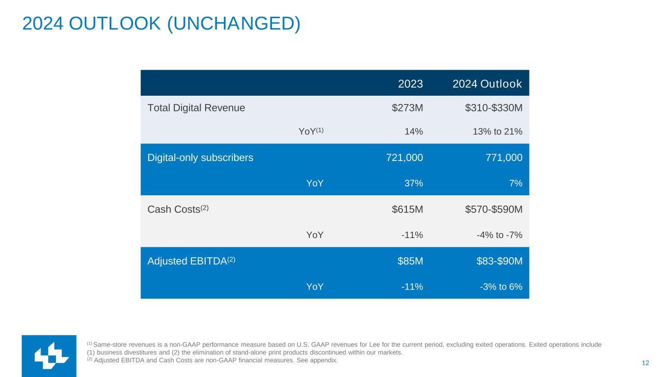 12 2024 OUTLOOK (UNCHANGED) 2023 2024 Outlook Total Digital Revenue $273M $310-$330M YoY(1) 14% 13% to 21% Digital-only subscribers 721,000 771,000 YoY 37% 7% Cash Costs(2) $615M $570-$590M YoY -11% -4% to -7% Adjusted EBITDA(2) $85M $83-$90M YoY -11% -3% to 6% (1) Same-store revenues is a non-GAAP performance measure based on U.S. GAAP revenues for Lee for the current period, excluding exited operations. Exited operations include (1) business divestitures and (2) the elimination of stand-alone print products discontinued within our markets. (2) Adjusted EBITDA and Cash Costs are non-GAAP financial measures. See appendix.