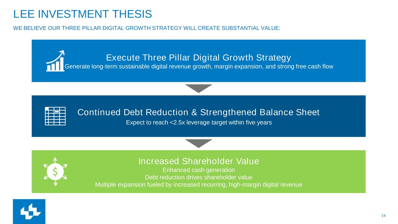 14 LEE INVESTMENT THESIS WE BELIEVE OUR THREE PILLAR DIGITAL GROWTH STRATEGY WILL CREATE SUBSTANTIAL VALUE: Increased Shareholder Value Enhanced cash generation Debt reduction drives shareholder value Multiple expansion fueled by increased recurring, high-margin digital revenue Continued Debt Reduction & Strengthened Balance Sheet Expect to reach <2.5x leverage target within five years Execute Three Pillar Digital Growth Strategy Generate long-term sustainable digital revenue growth, margin expansion, and strong free cash flow