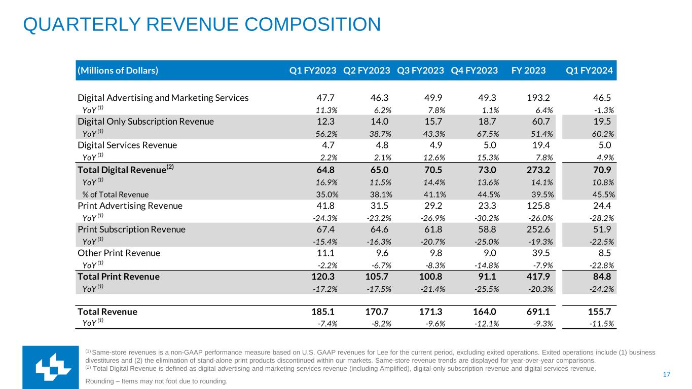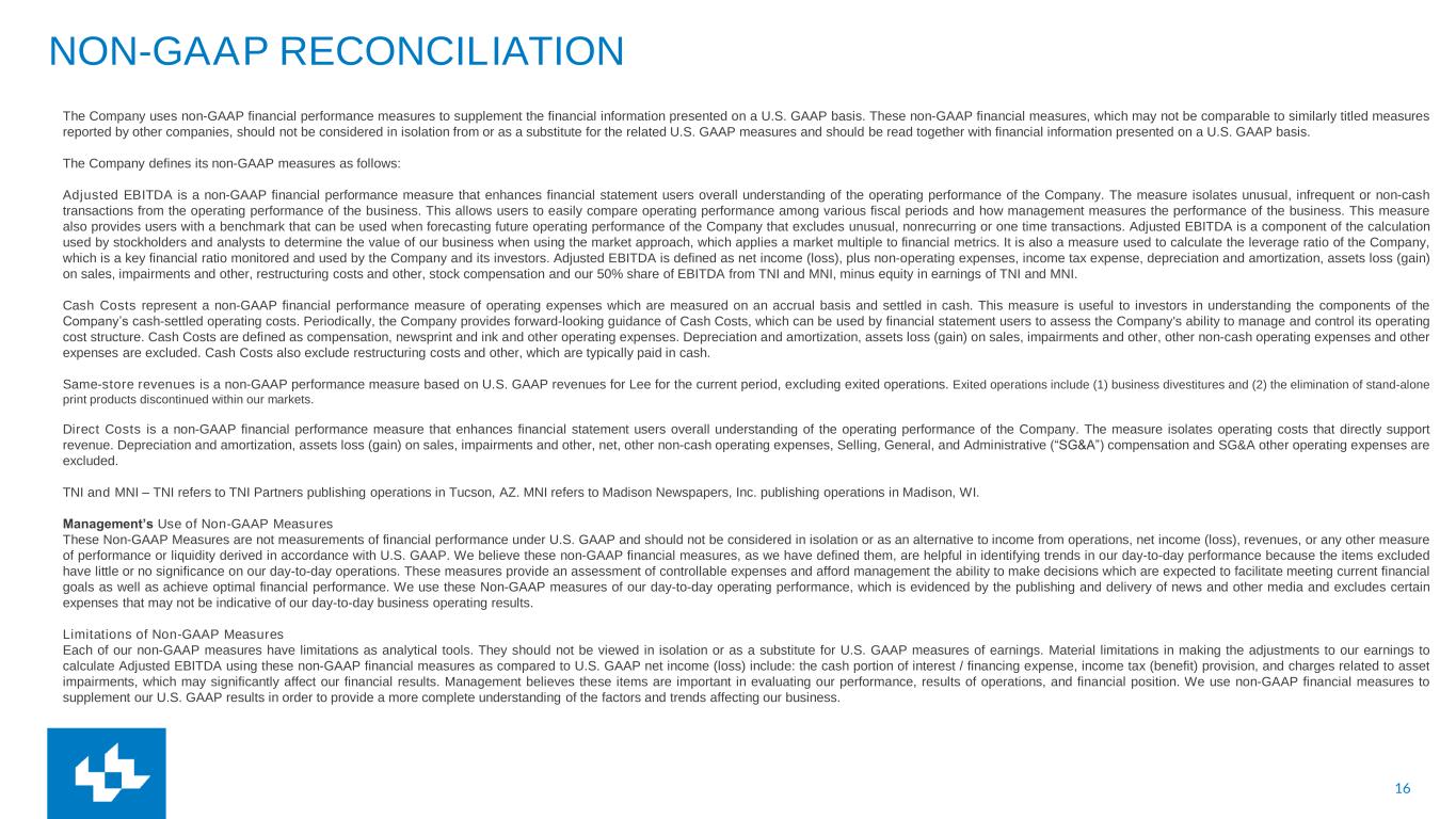 16 NON-GAAP RECONCILIATION The Company uses non-GAAP financial performance measures to supplement the financial information presented on a U.S. GAAP basis. These non-GAAP financial measures, which may not be comparable to similarly titled measures reported by other companies, should not be considered in isolation from or as a substitute for the related U.S. GAAP measures and should be read together with financial information presented on a U.S. GAAP basis. The Company defines its non-GAAP measures as follows: Adjusted EBITDA is a non-GAAP financial performance measure that enhances financial statement users overall understanding of the operating performance of the Company. The measure isolates unusual, infrequent or non-cash transactions from the operating performance of the business. This allows users to easily compare operating performance among various fiscal periods and how management measures the performance of the business. This measure also provides users with a benchmark that can be used when forecasting future operating performance of the Company that excludes unusual, nonrecurring or one time transactions. Adjusted EBITDA is a component of the calculation used by stockholders and analysts to determine the value of our business when using the market approach, which applies a market multiple to financial metrics. It is also a measure used to calculate the leverage ratio of the Company, which is a key financial ratio monitored and used by the Company and its investors. Adjusted EBITDA is defined as net income (loss), plus non-operating expenses, income tax expense, depreciation and amortization, assets loss (gain) on sales, impairments and other, restructuring costs and other, stock compensation and our 50% share of EBITDA from TNI and MNI, minus equity in earnings of TNI and MNI. Cash Costs represent a non-GAAP financial performance measure of operating expenses which are measured on an accrual basis and settled in cash. This measure is useful to investors in understanding the components of the Company’s cash-settled operating costs. Periodically, the Company provides forward-looking guidance of Cash Costs, which can be used by financial statement users to assess the Company's ability to manage and control its operating cost structure. Cash Costs are defined as compensation, newsprint and ink and other operating expenses. Depreciation and amortization, assets loss (gain) on sales, impairments and other, other non-cash operating expenses and other expenses are excluded. Cash Costs also exclude restructuring costs and other, which are typically paid in cash. Same-store revenues is a non-GAAP performance measure based on U.S. GAAP revenues for Lee for the current period, excluding exited operations. Exited operations include (1) business divestitures and (2) the elimination of stand-alone print products discontinued within our markets. Direct Costs is a non-GAAP financial performance measure that enhances financial statement users overall understanding of the operating performance of the Company. The measure isolates operating costs that directly support revenue. Depreciation and amortization, assets loss (gain) on sales, impairments and other, net, other non-cash operating expenses, Selling, General, and Administrative (“SG&A”) compensation and SG&A other operating expenses are excluded. TNI and MNI – TNI refers to TNI Partners publishing operations in Tucson, AZ. MNI refers to Madison Newspapers, Inc. publishing operations in Madison, WI. Management’s Use of Non-GAAP Measures These Non-GAAP Measures are not measurements of financial performance under U.S. GAAP and should not be considered in isolation or as an alternative to income from operations, net income (loss), revenues, or any other measure of performance or liquidity derived in accordance with U.S. GAAP. We believe these non-GAAP financial measures, as we have defined them, are helpful in identifying trends in our day-to-day performance because the items excluded have little or no significance on our day-to-day operations. These measures provide an assessment of controllable expenses and afford management the ability to make decisions which are expected to facilitate meeting current financial goals as well as achieve optimal financial performance. We use these Non-GAAP measures of our day-to-day operating performance, which is evidenced by the publishing and delivery of news and other media and excludes certain expenses that may not be indicative of our day-to-day business operating results. Limitations of Non-GAAP Measures Each of our non-GAAP measures have limitations as analytical tools. They should not be viewed in isolation or as a substitute for U.S. GAAP measures of earnings. Material limitations in making the adjustments to our earnings to calculate Adjusted EBITDA using these non-GAAP financial measures as compared to U.S. GAAP net income (loss) include: the cash portion of interest / financing expense, income tax (benefit) provision, and charges related to asset impairments, which may significantly affect our financial results. Management believes these items are important in evaluating our performance, results of operations, and financial position. We use non-GAAP financial measures to supplement our U.S. GAAP results in order to provide a more complete understanding of the factors and trends affecting our business.