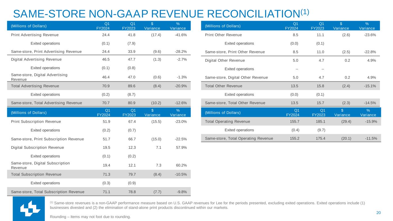 (2)Same-store revenues is a non-GAAP performance measure based on U.S. GAAP revenues for Lee for the current period, excluding exited operations. Exited operations include (1) business divestitures and (2) the elimination of stand-alone print products discontinued within our markets.