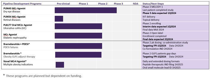 Our new product development activities in inflammation disease indications focus primarily on development of MCr peptides for ocular conditions, but also include conditions in the gut and kidney. Utilizing peptides which are agonists at MC1r, and in some instances agonists at additional melanocortin receptors, we are developing products to treat inflammatory and autoimmune diseases such as dry eye disease (also known as keratoconjunctivitis sicca), uveitis, diabetic retinopathy, and inflammatory bowel disease. We believe that our MC1r agonist peptides have broad anti-inflammatory effects and utilize mechanisms engaged by the endogenous melanocortin system in regulation of the immune system and resolution of inflammatory responses. We are also developing peptides that are active at more than one melanocortin receptor and small molecule MCr agonists.