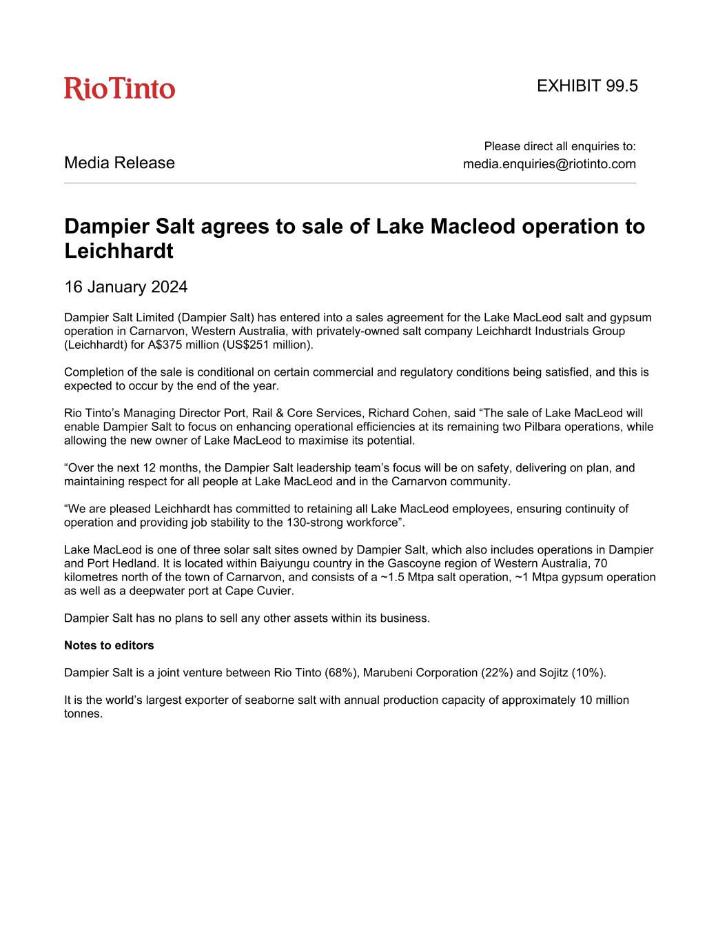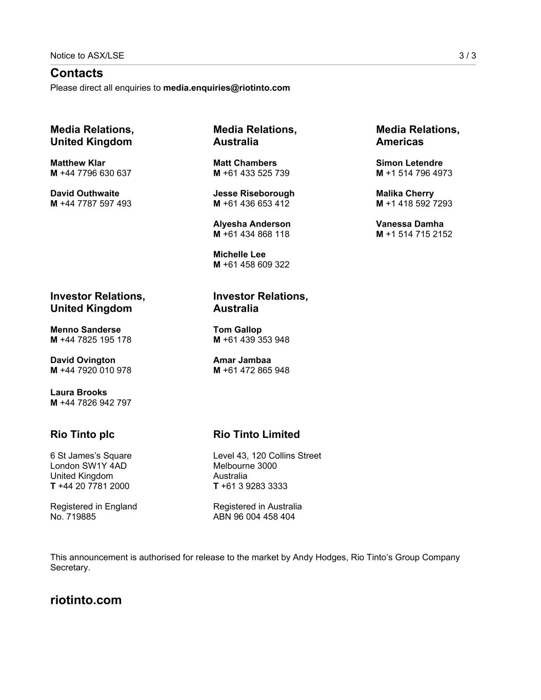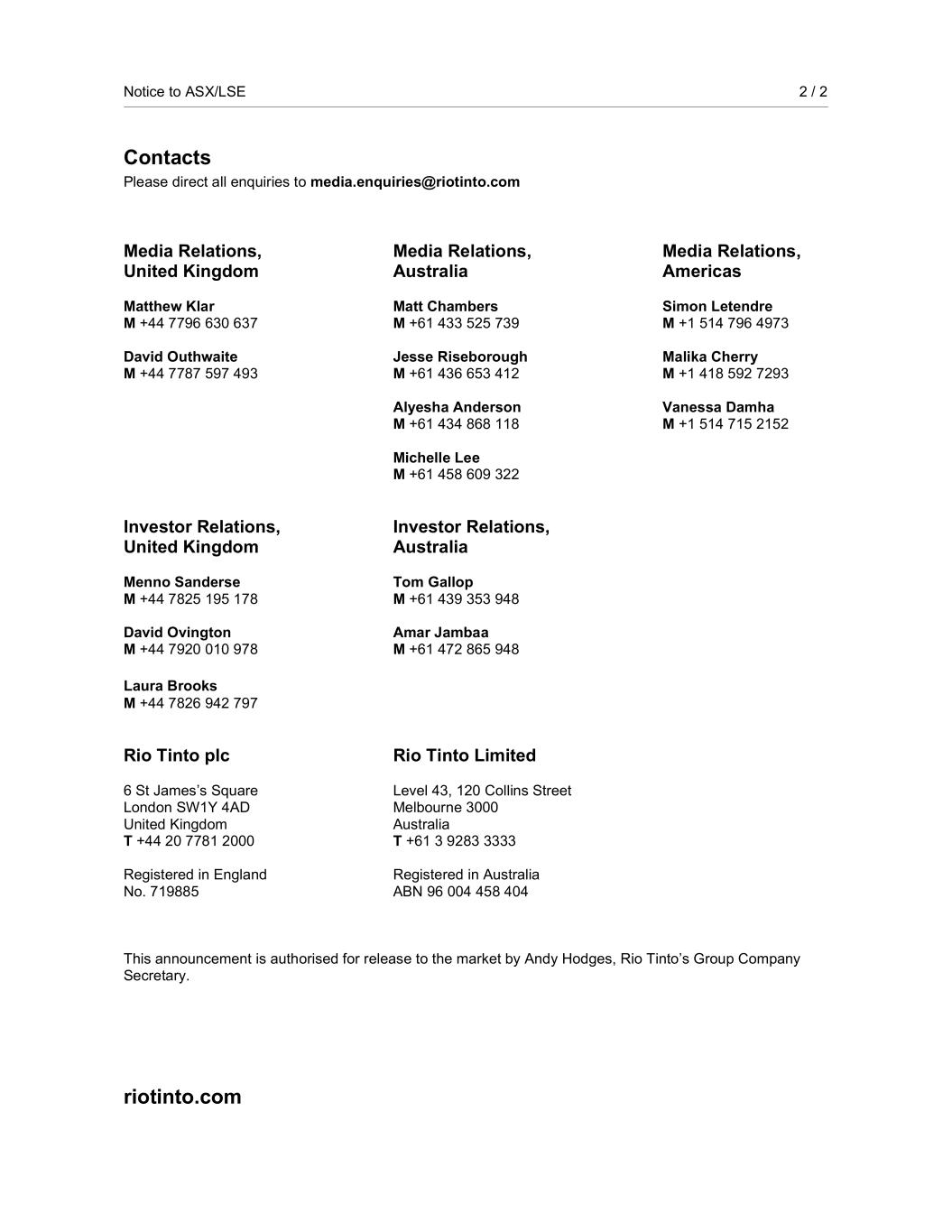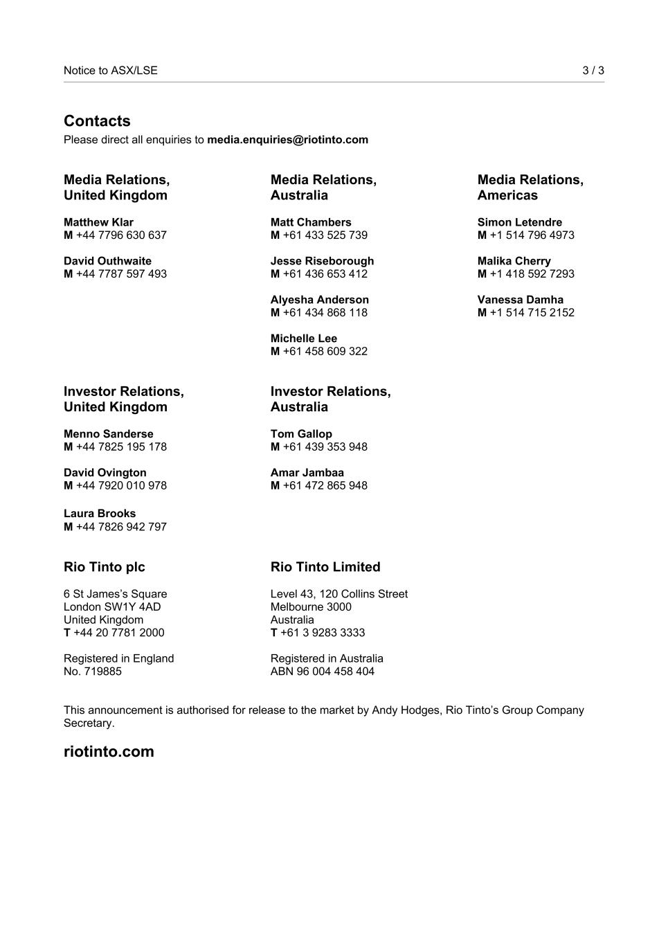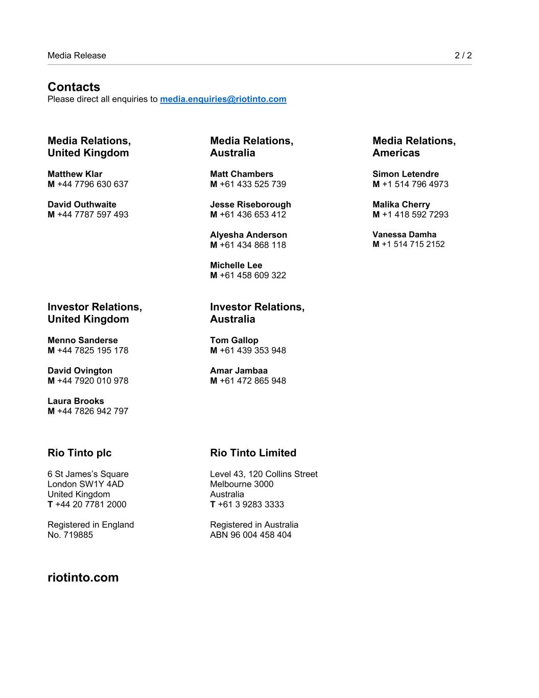 | Rio Tinto plc | Rio Tinto Limited |