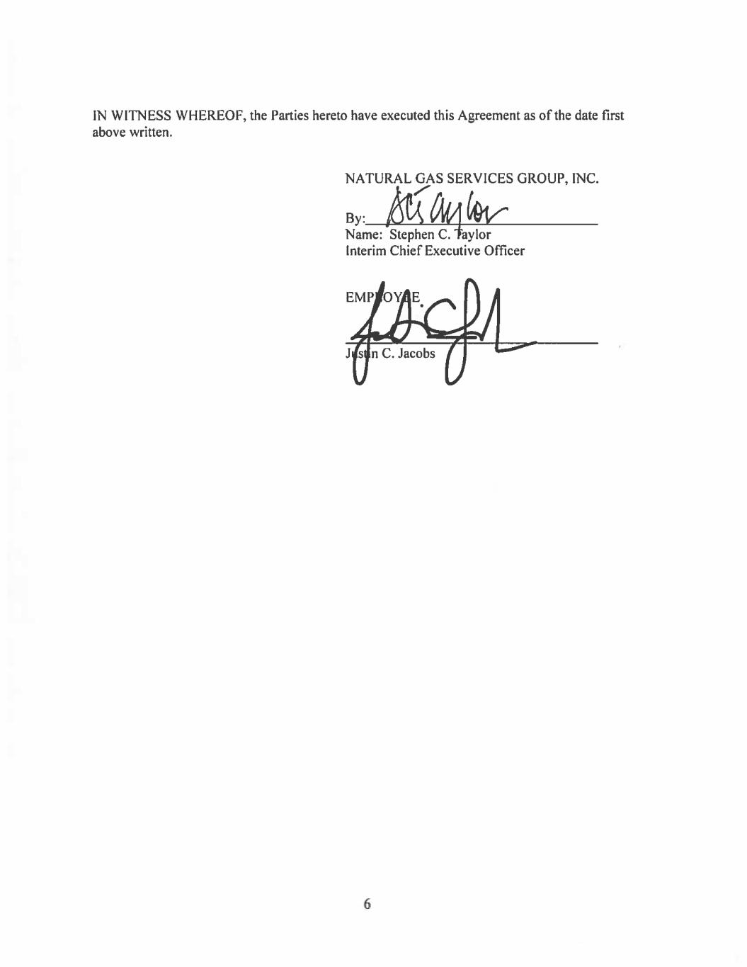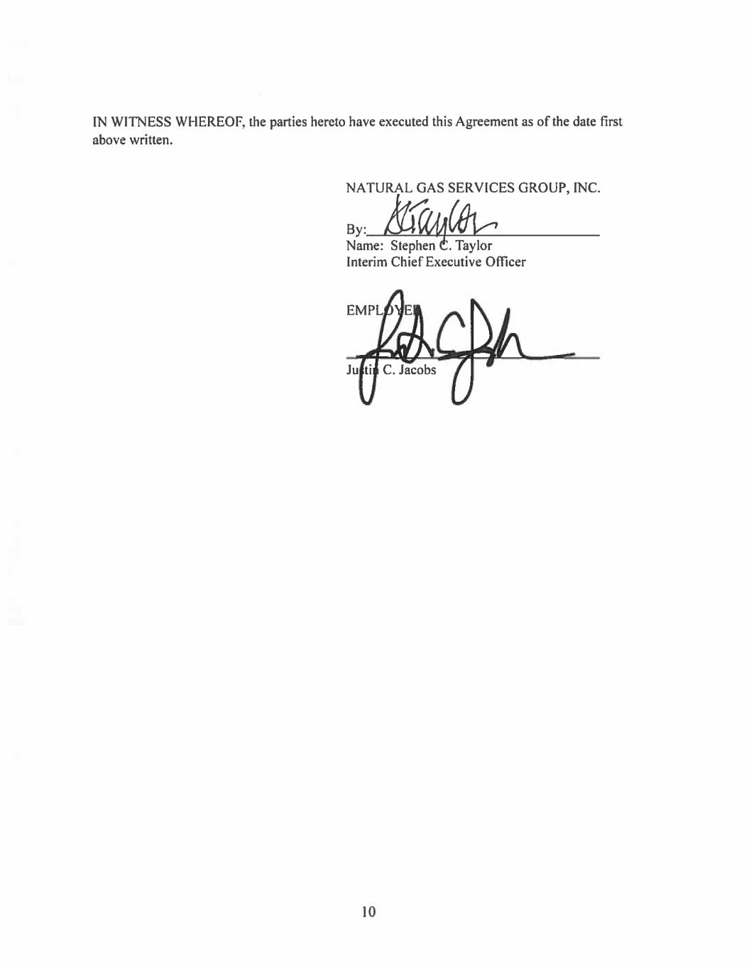 This Employment Agreement (the “Agreement”) is made and entered into as of January 29, 2024 (the “Agreement Date”), by and between Justin C. Jacobs (the “Executive”) and Natural Gas Services Group, Inc., a Colorado corporation (the “Company”).