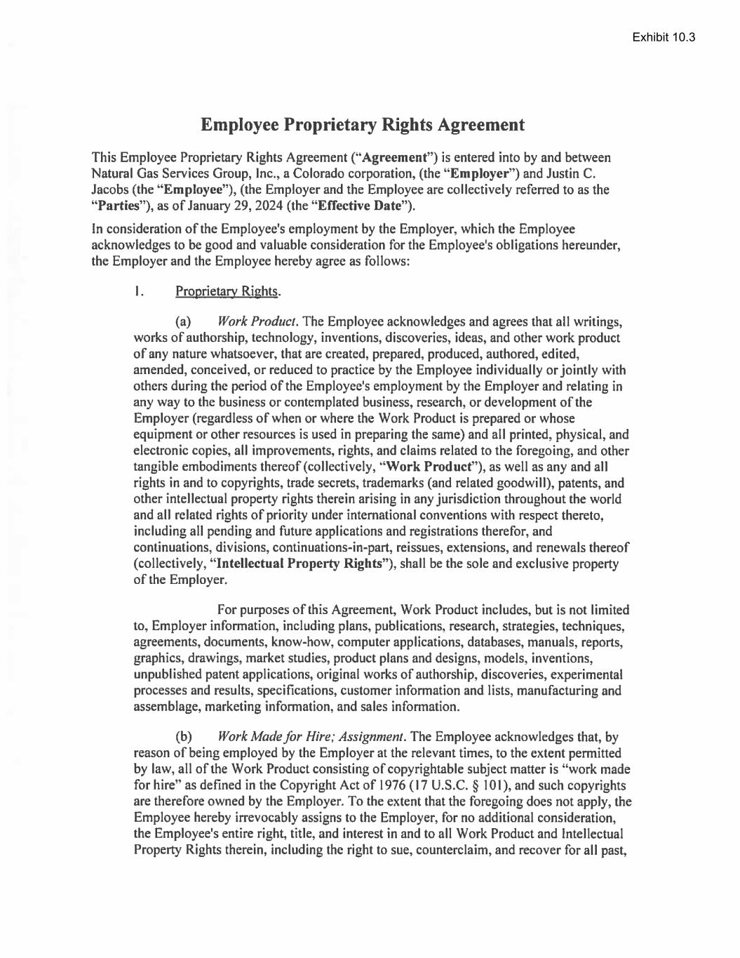 | Employee Proprietary Rights Agreement between Justin C. Jacobs and Natural Gas Services Group, Inc. dated January 29, 2024. |