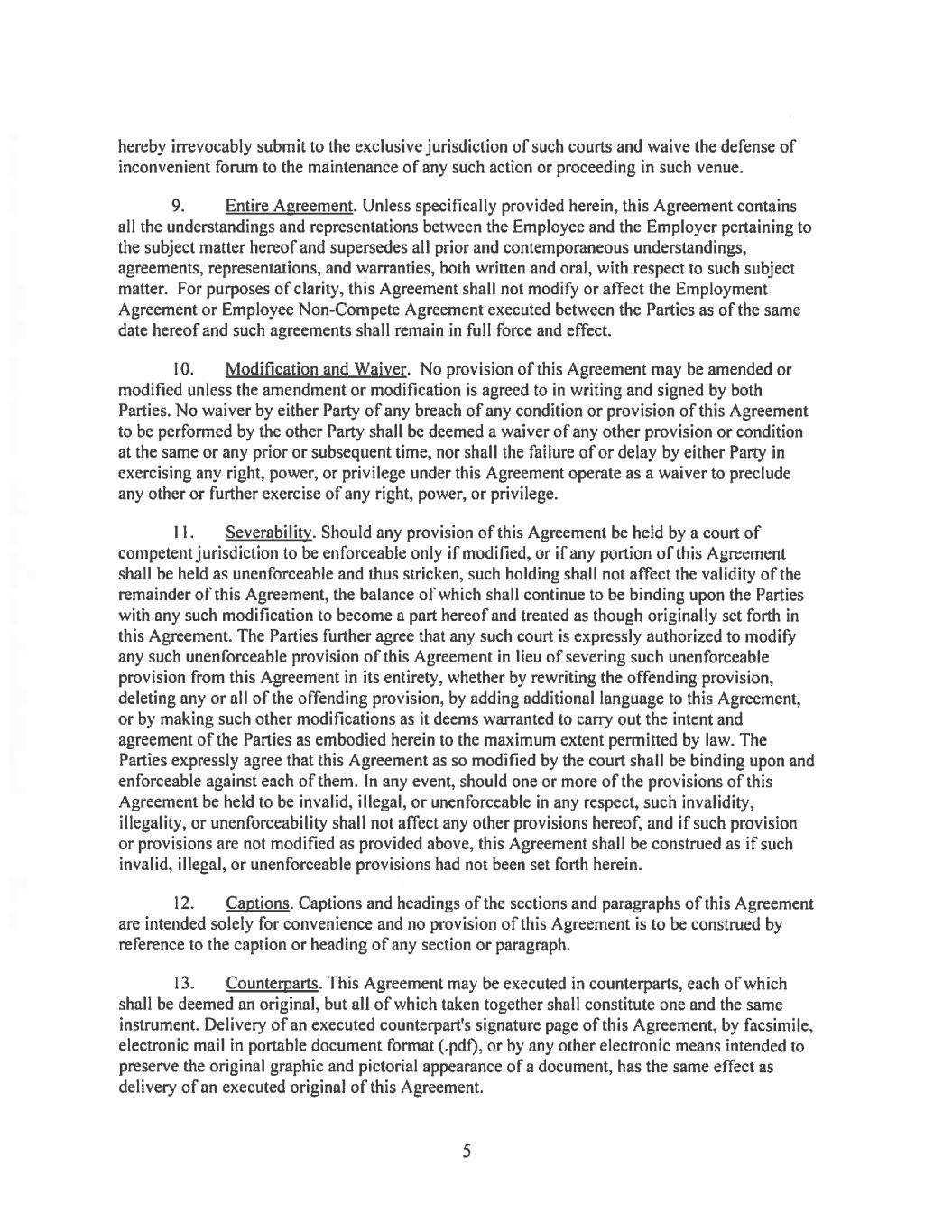 11.Modification and Waiver. No provision of this Agreement may be amended or modified unless such amendment or modification is agreed to in writing and signed by the Executive and by the Chairperson of the Compensation Committee of the Board. No waiver by either of the parties of any breach by the other party hereto of any condition or provision of this Agreement to be performed by the other party hereto shall be deemed a waiver of any similar or dissimilar provision or condition at the same or any prior or subsequent time.
