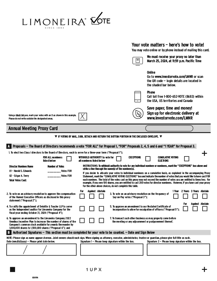 These matters are more fully described in the enclosed proxy statement. The Board of Directors recommends that you vote FOR ALL the director nominees, FOR the advisory approval of the compensation of the Named Executive Officers, for every ONE year as to the frequency of Say-on-Pay votes, FOR the ratification of the independent auditors, FOR the amendment of our Restated Certificate of Incorporation, and FOR the amendment to the Limoneira Company 2022 Omnibus Incentive Plan.