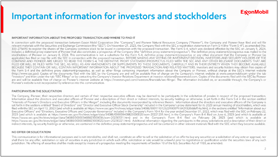 In connection with the proposed transaction between Exxon Mobil Corporation (the “Company”) and Pioneer Natural Resources Company (“Pioneer”), the Company and Pioneer have filed and will file relevant materials with the Securities and Exchange Commission (the “SEC”). On November 21, 2023, the Company filed with the SEC a registration statement on Form S-4 (the “Form S-4”), as amended (No. 333-275695) to register the shares of the Company common stock to be issued in connection with the proposed transaction. The Form S-4, which was declared effective by the SEC on January 5, 2024, includes a definitive proxy statement of Pioneer that also constitutes a prospectus of the Company (the “definitive proxy statement/prospectus”). The definitive proxy statement/prospectus was mailed to the stockholders of Pioneer on January 8, 2024. This communication is not a substitute for the Form S-4, definitive proxy statement/prospectus or any other document that the Company or Pioneer (as applicable) has filed or may file with the SEC in connection with the proposed transaction. BEFORE MAKING ANY VOTING OR INVESTMENT DECISION, INVESTORS AND SECURITY HOLDERS OF THE COMPANY AND PIONEER ARE URGED TO READ THE FORM S-4, THE DEFINITIVE PROXY STATEMENT/PROSPECTUS FILED WITH THE SEC AND ANY OTHER RELEVANT DOCUMENTS THAT ARE FILED OR WILL BE FILED WITH THE SEC, AS WELL AS ANY AMENDMENTS OR SUPPLEMENTS TO THESE DOCUMENTS, CAREFULLY AND IN THEIR ENTIRETY WHEN THEY BECOME AVAILABLE BECAUSE THEY CONTAIN OR WILL CONTAIN IMPORTANT INFORMATION ABOUT THE PROPOSED TRANSACTION AND RELATED MATTERS. Investors and security holders may obtain free copies of the Form S-4 and the definitive proxy statement/prospectus, as well as other filings containing important information about the Company or Pioneer, without charge at the SEC’s Internet website (http://www.sec.gov). Copies of the documents filed with the SEC by the Company are and will be available free of charge on the Company’s internet website at www.exxonmobil.com under the tab “investors” and then under the tab “SEC Filings” or by contacting the Company’s Investor Relations Department at investor.relations@exxonmobil.com. Copies of the documents filed with the SEC by Pioneer are and will be available free of charge on Pioneer’s internet website at https://investors.pxd.com/investors/financials/sec-filings/. The information included on, or accessible through, the Company’s or Pioneer’s website is not incorporated by reference into this communication.