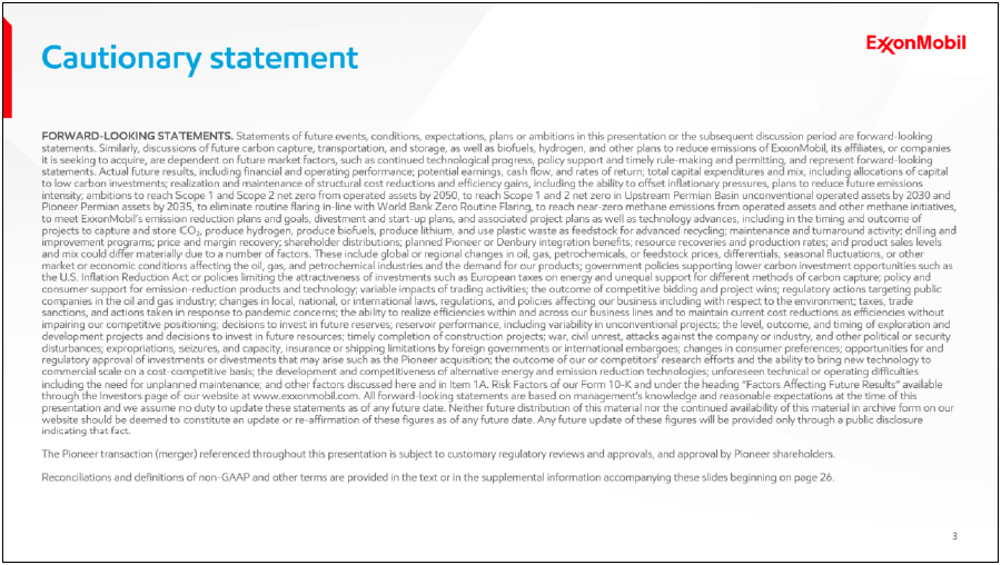 This communication contains “forward-looking statements” within the meaning of the federal securities laws, including Section 27A of the Securities Act of 1933, as amended, and Section 21E of the Securities Exchange Act of 1934, as amended. In this context, forward-looking statements often address future business and financial events, conditions, expectations, plans or ambitions, and often contain words such as “expect,” “anticipate,” “intend,” “plan,” “believe,” “seek,” “see,” “will,” “would,” “target,” similar expressions, and variations or negatives of these words, but not all forward-looking statements include such words. Forward-looking statements by their nature address matters that are, to different degrees, uncertain, such as statements about the consummation of the proposed transaction and the anticipated benefits thereof. All such forward-looking statements are based upon current plans, estimates, expectations and ambitions that are subject to risks, uncertainties and assumptions, many of which are beyond the control of the Company and Pioneer, that could cause actual results to differ materially from those expressed in such forward-looking statements. Important risk factors that may cause such a difference include, but are not limited to: the completion of the proposed transaction on anticipated terms and timing, or at all, including obtaining regulatory approvals that may be required on anticipated terms and Pioneer stockholder approval; anticipated tax treatment, unforeseen liabilities, future capital expenditures, revenues, expenses, earnings, synergies, economic performance, indebtedness, financial condition, losses, future prospects, business and management strategies for the management, expansion and growth of the combined company’s operations and other conditions to the completion of the proposed transaction, including the possibility that any of the anticipated benefits of the proposed transaction will not be realized or will not be realized within the expected time period; the ability of the Company and Pioneer to integrate the business successfully and to achieve anticipated synergies and value creation; potential litigation relating to the proposed transaction that could be instituted against the Company, Pioneer or their respective directors; the risk that disruptions from the proposed transaction will harm the Company’s or Pioneer’s business, including current plans and operations and that management’s time and attention will be diverted on transaction-related issues; potential adverse reactions or changes to business relationships resulting from the announcement or completion of the proposed transaction; rating agency actions and the Company and Pioneer’s ability to access short- and long-term debt markets on a timely and affordable basis; legislative, regulatory and economic developments, including regulatory actions targeting public companies in the oil and gas industry and changes in local, national, or international laws, regulations, and policies affecting the Company and Pioneer including with respect to the environment; potential business uncertainty, including the outcome of commercial negotiations and changes to existing business relationships during the pendency of the proposed transaction that could affect the Company’s and/or Pioneer’s financial performance and operating results; certain restrictions during the pendency of the proposed transaction that may impact Pioneer’s ability to pursue certain business opportunities or strategic transactions or otherwise operate its business; acts of terrorism or outbreak of war, hostilities, civil unrest, attacks against the Company or Pioneer, and other political or security disturbances; dilution caused by the Company’s issuance of additional shares of its common stock in connection with the proposed transaction; the possibility that the transaction may be more expensive to complete than anticipated, including as a result of unexpected factors or events; changes in policy and consumer support for emission-reduction products and technology; the impacts of pandemics or other public health crises, including the effects of government responses on people and economies; global or regional changes in the supply and demand for oil, natural gas, petrochemicals, and feedstocks and other market or economic conditions that impact demand, prices and differentials, including reservoir performance; changes in technical or operating conditions, including unforeseen technical difficulties; those risks described in Item 1A of the Company’s Annual Report on Form 10-K, filed with the SEC on February 22, 2023, and subsequent reports on Forms 10-Q and 8-K, as well as under the heading “Factors Affecting Future Results” on the Investors page of the Company’s website at www.exxonmobil.com (information included on or accessible through the Company’s website is not incorporated by reference into this communication); those risks described in Item 1A of Pioneer’s Annual Report on Form 10-K, filed with the SEC on February 23, 2023, and subsequent reports on Forms 10-Q and 8-K; and those risks described in the registration statement on Form S-4 and accompanying definitive proxy statement/prospectus available from the sources indicated above. References to resources or other quantities of oil or natural gas may include amounts that the Company or Pioneer believe will ultimately be produced, but that are not yet classified as “proved reserves” under SEC definitions.