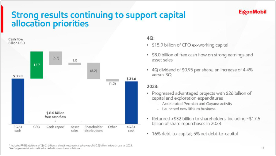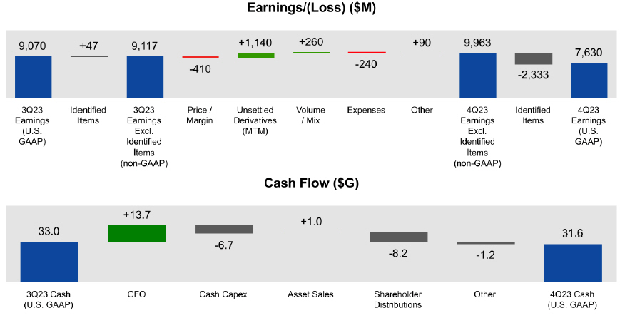 | • | Generated strong cash flow from operations of $13.7 billion and free cash flow of $8.0 billion in the fourth quarter. For the full year, cash increased $1.9 billion with free cash flow of $36.1 billion. Peer-leading1 2023 shareholder distributions of $32.4 billion included $14.9 billion of dividends, and $17.4 billion of share repurchases consistent with announced plans. |