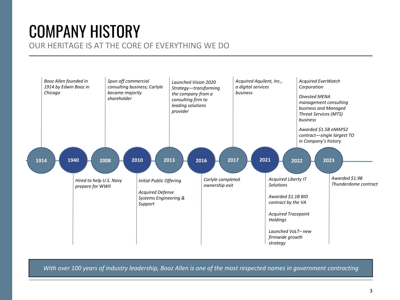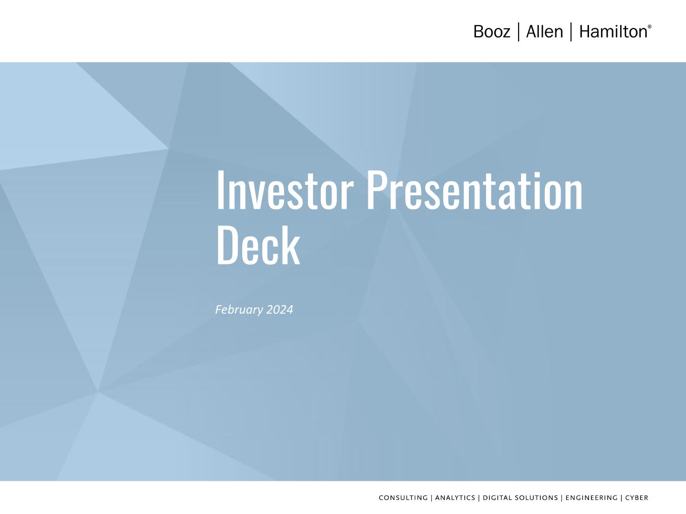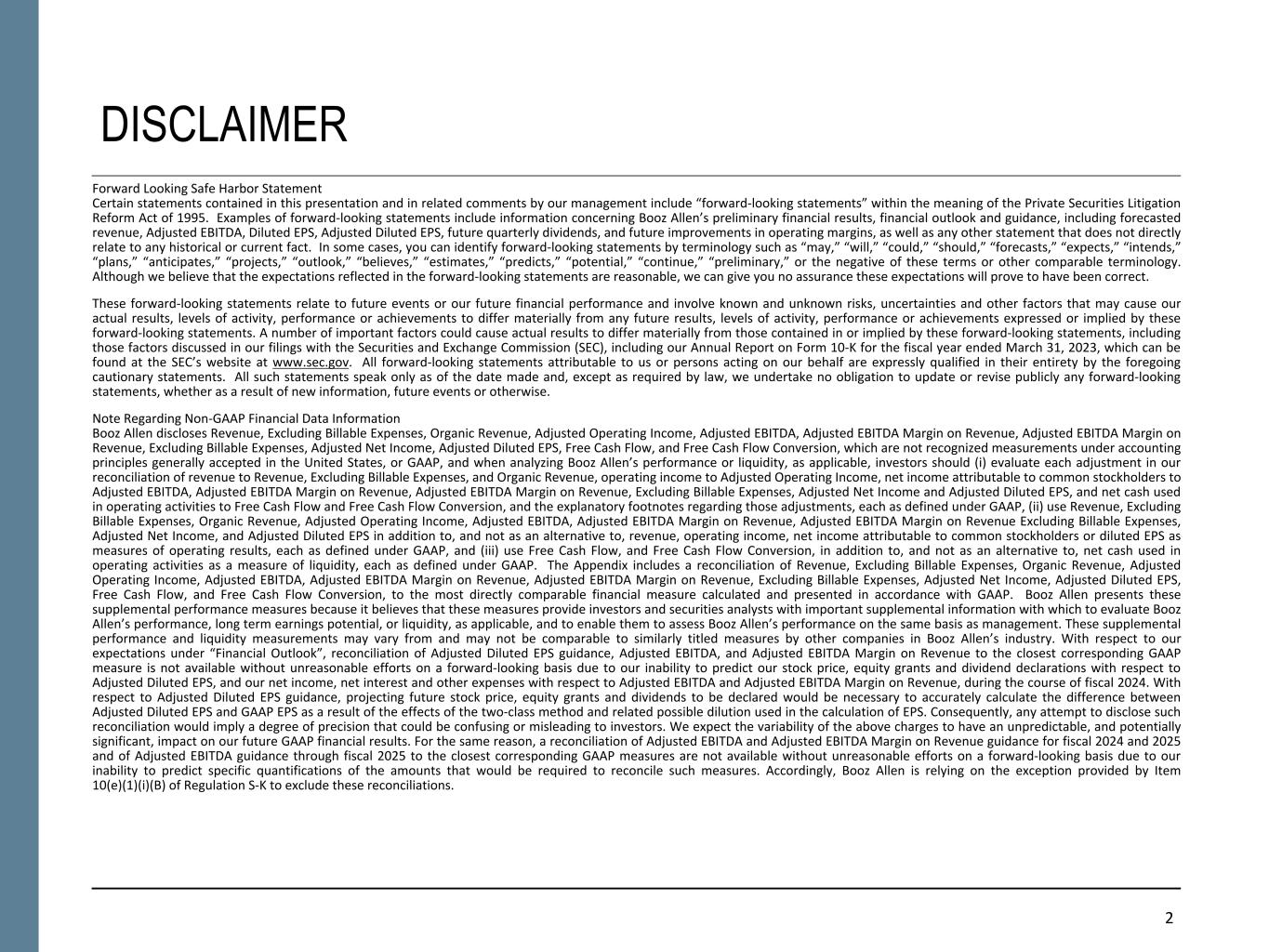 2 DISCLAIMER Forward Looking Safe Harbor Statement Certain statements contained in this presentation and in related comments by our management include “forward-looking statements” within the meaning of the Private Securities Litigation Reform Act of 1995. Examples of forward-looking statements include information concerning Booz Allen’s preliminary financial results, financial outlook and guidance, including forecasted revenue, Adjusted EBITDA, Diluted EPS, Adjusted Diluted EPS, future quarterly dividends, and future improvements in operating margins, as well as any other statement that does not directly relate to any historical or current fact. In some cases, you can identify forward-looking statements by terminology such as “may,” “will,” “could,” “should,” “forecasts,” “expects,” “intends,” “plans,” “anticipates,” “projects,” “outlook,” “believes,” “estimates,” “predicts,” “potential,” “continue,” “preliminary,” or the negative of these terms or other comparable terminology. Although we believe that the expectations reflected in the forward-looking statements are reasonable, we can give you no assurance these expectations will prove to have been correct. These forward-looking statements relate to future events or our future financial performance and involve known and unknown risks, uncertainties and other factors that may cause our actual results, levels of activity, performance or achievements to differ materially from any future results, levels of activity, performance or achievements expressed or implied by these forward-looking statements. A number of important factors could cause actual results to differ materially from those contained in or implied by these forward-looking statements, including those factors discussed in our filings with the Securities and Exchange Commission (SEC), including our Annual Report on Form 10-K for the fiscal year ended March 31, 2023, which can be found at the SEC’s website at www.sec.gov. All forward-looking statements attributable to us or persons acting on our behalf are expressly qualified in their entirety by the foregoing cautionary statements. All such statements speak only as of the date made and, except as required by law, we undertake no obligation to update or revise publicly any forward-looking statements, whether as a result of new information, future events or otherwise. Note Regarding Non-GAAP Financial Data Information Booz Allen discloses Revenue, Excluding Billable Expenses, Organic Revenue, Adjusted Operating Income, Adjusted EBITDA, Adjusted EBITDA Margin on Revenue, Adjusted EBITDA Margin on Revenue, Excluding Billable Expenses, Adjusted Net Income, Adjusted Diluted EPS, Free Cash Flow, and Free Cash Flow Conversion, which are not recognized measurements under accounting principles generally accepted in the United States, or GAAP, and when analyzing Booz Allen’s performance or liquidity, as applicable, investors should (i) evaluate each adjustment in our reconciliation of revenue to Revenue, Excluding Billable Expenses, and Organic Revenue, operating income to Adjusted Operating Income, net income attributable to common stockholders to Adjusted EBITDA, Adjusted EBITDA Margin on Revenue, Adjusted EBITDA Margin on Revenue, Excluding Billable Expenses, Adjusted Net Income and Adjusted Diluted EPS, and net cash used in operating activities to Free Cash Flow and Free Cash Flow Conversion, and the explanatory footnotes regarding those adjustments, each as defined under GAAP, (ii) use Revenue, Excluding Billable Expenses, Organic Revenue, Adjusted Operating Income, Adjusted EBITDA, Adjusted EBITDA Margin on Revenue, Adjusted EBITDA Margin on Revenue Excluding Billable Expenses, Adjusted Net Income, and Adjusted Diluted EPS in addition to, and not as an alternative to, revenue, operating income, net income attributable to common stockholders or diluted EPS as measures of operating results, each as defined under GAAP, and (iii) use Free Cash Flow, and Free Cash Flow Conversion, in addition to, and not as an alternative to, net cash used in operating activities as a measure of liquidity, each as defined under GAAP. The Appendix includes a reconciliation of Revenue, Excluding Billable Expenses, Organic Revenue, Adjusted Operating Income, Adjusted EBITDA, Adjusted EBITDA Margin on Revenue, Adjusted EBITDA Margin on Revenue, Excluding Billable Expenses, Adjusted Net Income, Adjusted Diluted EPS, Free Cash Flow, and Free Cash Flow Conversion, to the most directly comparable financial measure calculated and presented in accordance with GAAP. Booz Allen presents these supplemental performance measures because it believes that these measures provide investors and securities analysts with important supplemental information with which to evaluate Booz Allen’s performance, long term earnings potential, or liquidity, as applicable, and to enable them to assess Booz Allen’s performance on the same basis as management. These supplemental performance and liquidity measurements may vary from and may not be comparable to similarly titled measures by other companies in Booz Allen’s industry. With respect to our expectations under “Financial Outlook”, reconciliation of Adjusted Diluted EPS guidance, Adjusted EBITDA, and Adjusted EBITDA Margin on Revenue to the closest corresponding GAAP measure is not available without unreasonable efforts on a forward-looking basis due to our inability to predict our stock price, equity grants and dividend declarations with respect to Adjusted Diluted EPS, and our net income, net interest and other expenses with respect to Adjusted EBITDA and Adjusted EBITDA Margin on Revenue, during the course of fiscal 2024. With respect to Adjusted Diluted EPS guidance, projecting future stock price, equity grants and dividends to be declared would be necessary to accurately calculate the difference between Adjusted Diluted EPS and GAAP EPS as a res
